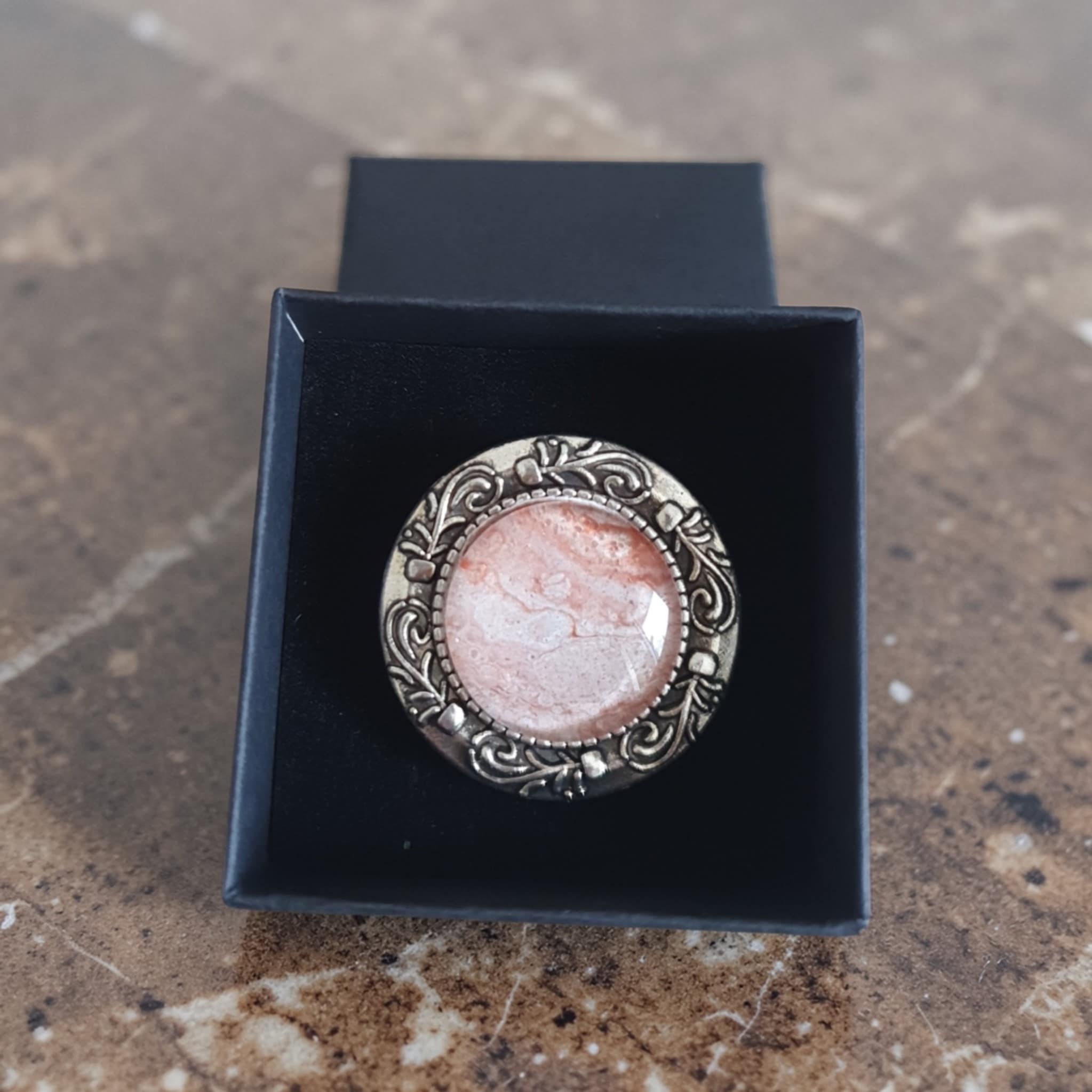 La bague Corolle d’Automne est une création artistique inspirée par la beauté des fleurs et les couleurs chaleureuses de la saison automnale. Les nuances de marron se déploient grâce à la technique du pouring, créant des mouvements doux et organiques qui évoquent les pétales d’une fleur d’automne et les teintes naturelles des feuilles et de la terre.