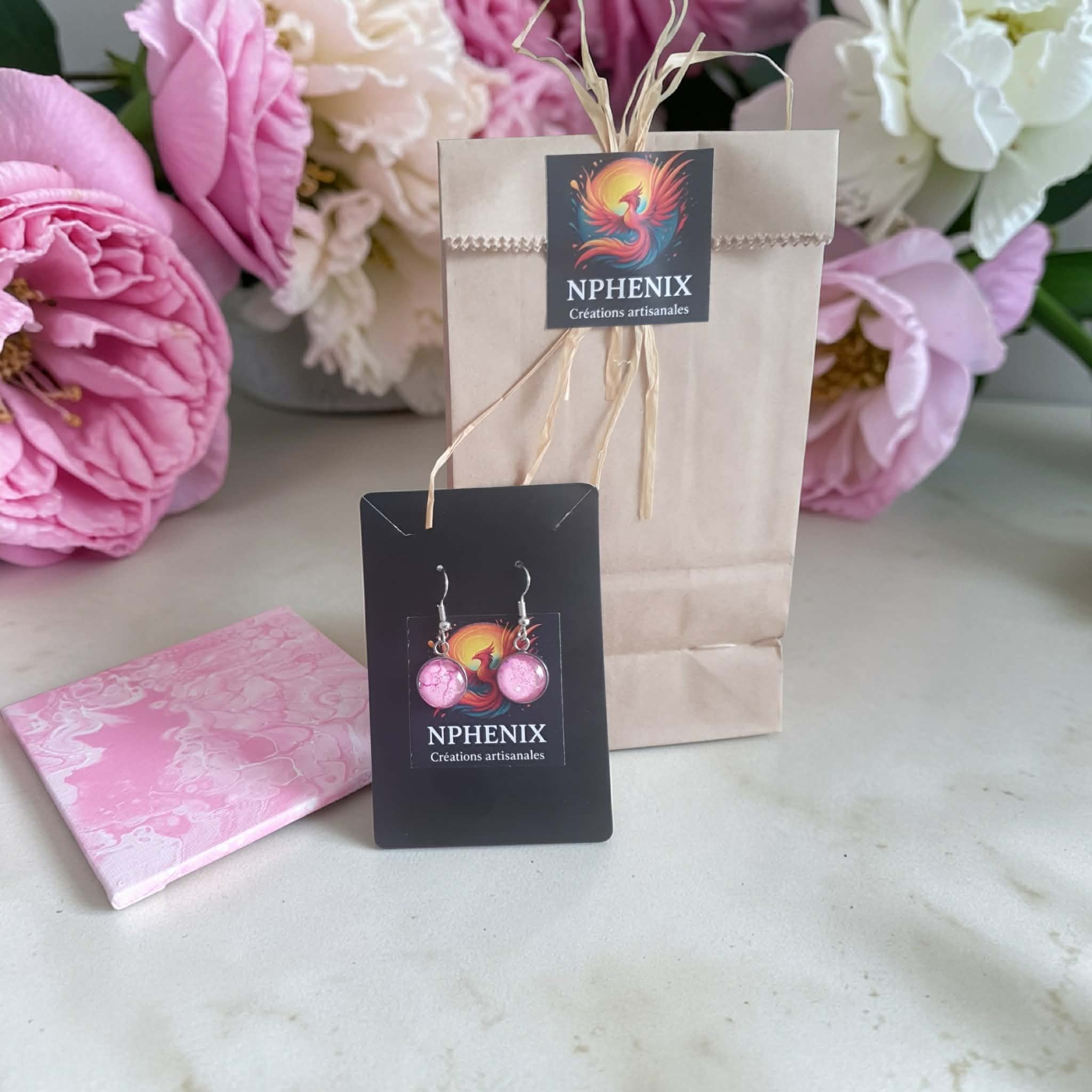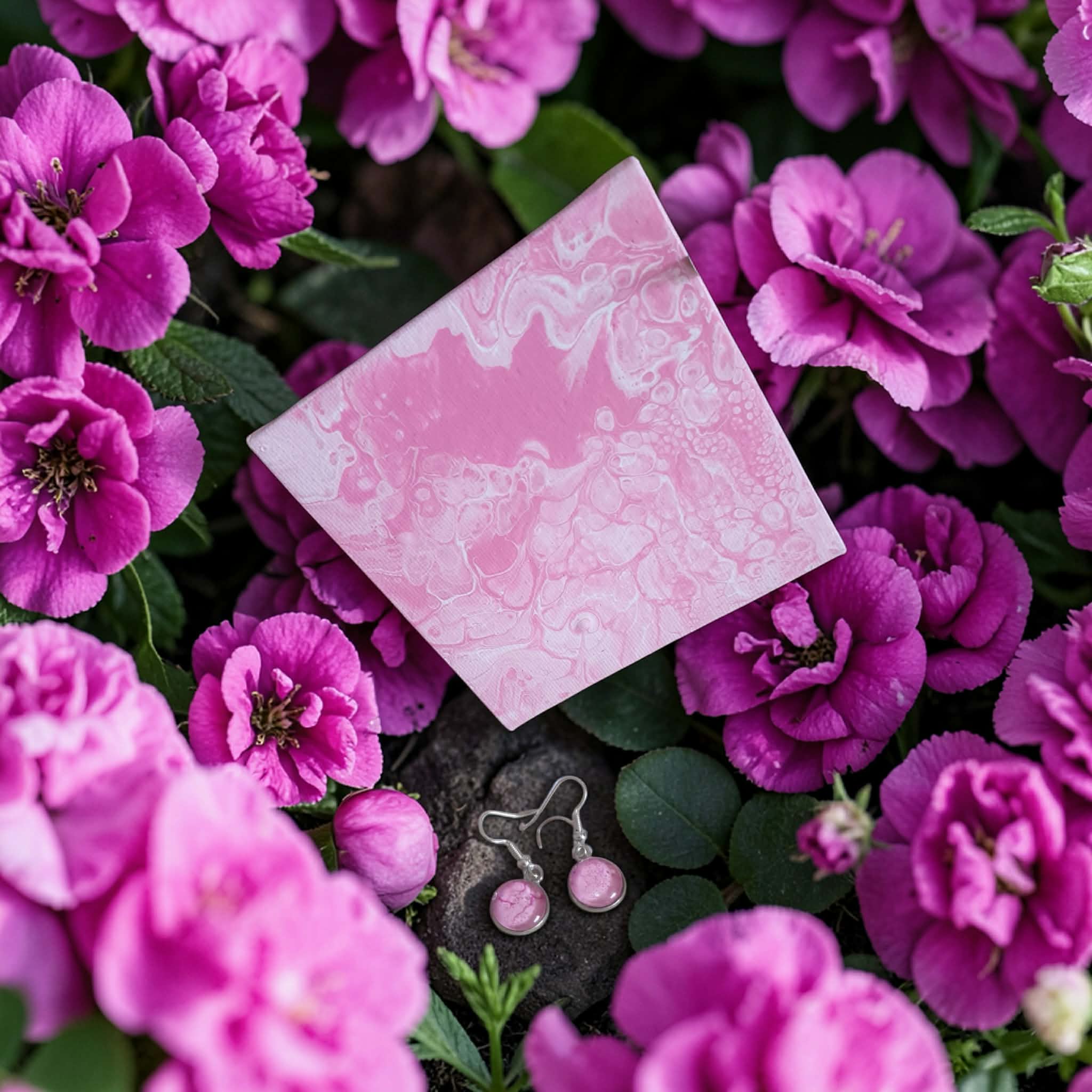 Les boucles d’oreilles Sakura est une création artistique inspirée de la délicatesse des fleurs de cerisier. Les différentes nuances de rose se déploient harmonieusement grâce à la technique du pouring, créant des mouvements doux et organiques qui évoquent les pétales emportés par le vent et la légèreté du printemps.