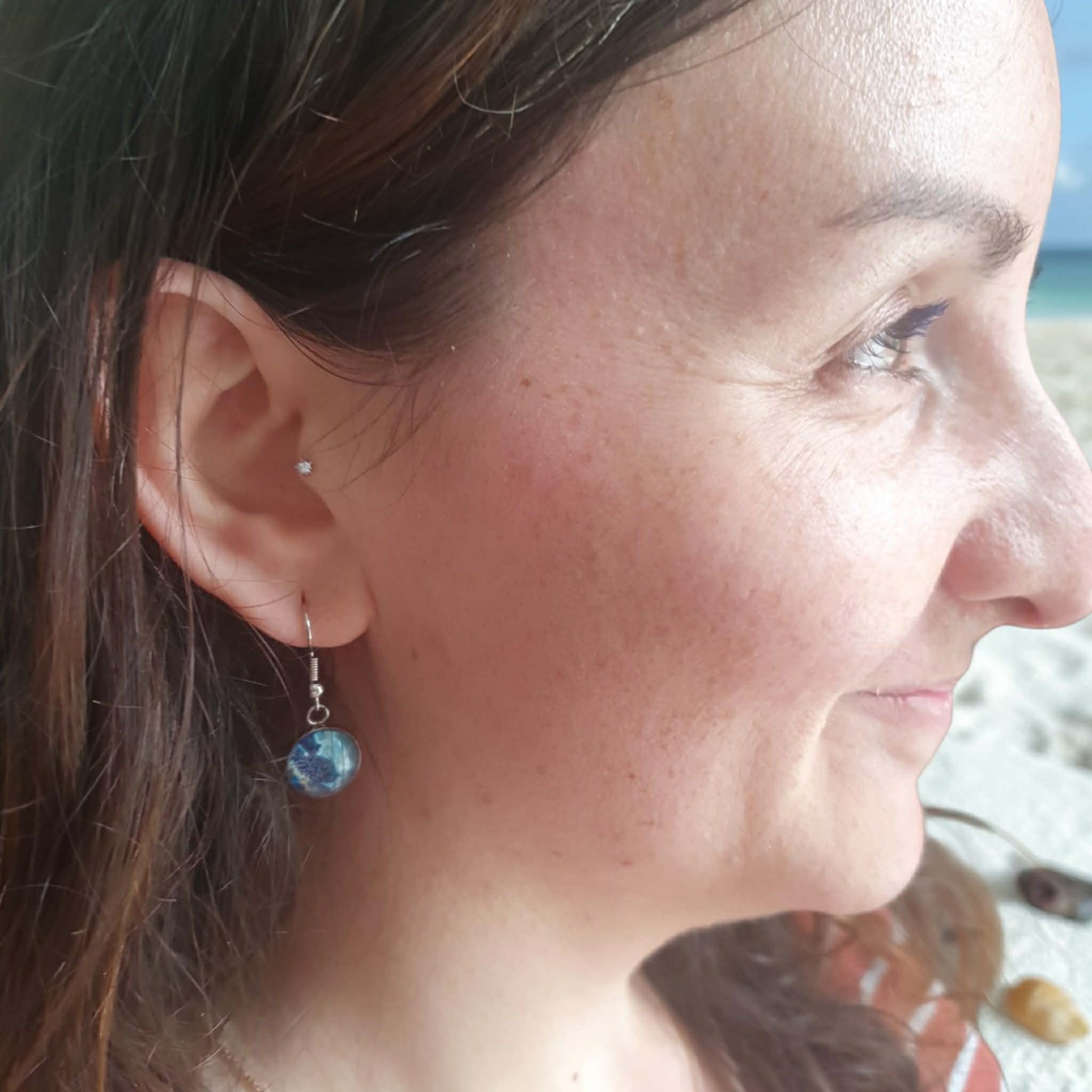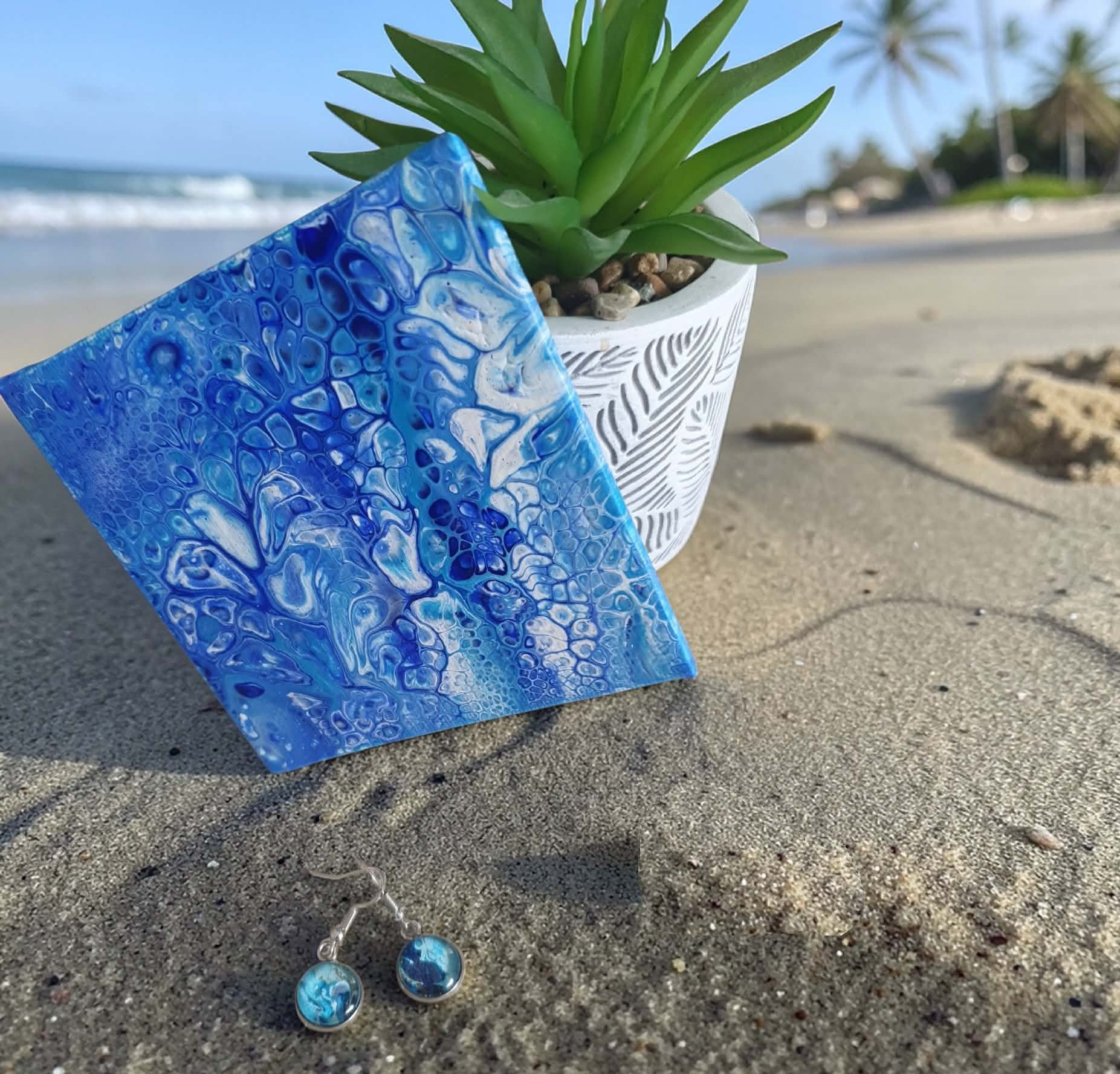 Les boucles d’oreilles Perle de l’Océan est une création artistique inspirée par la profondeur et le mouvement des mers. Les différentes nuances de bleu, plus ou moins foncées, se mêlent grâce à la technique du pouring, créant des effets fluides et organiques qui évoquent les vagues, les courants marins et les mystères de l’océan.