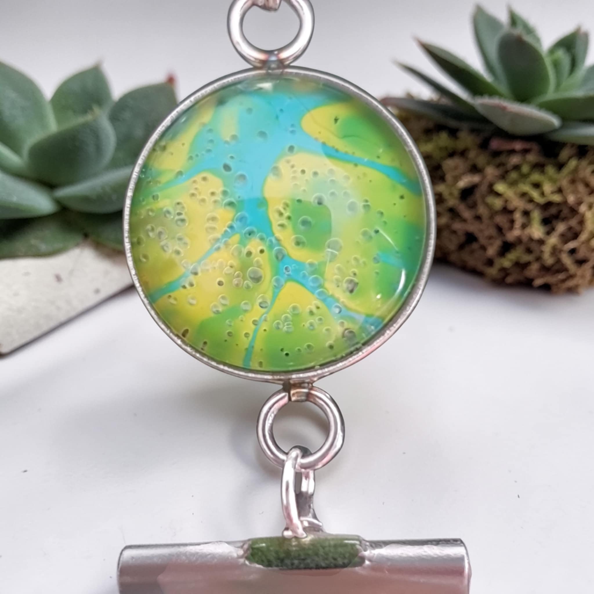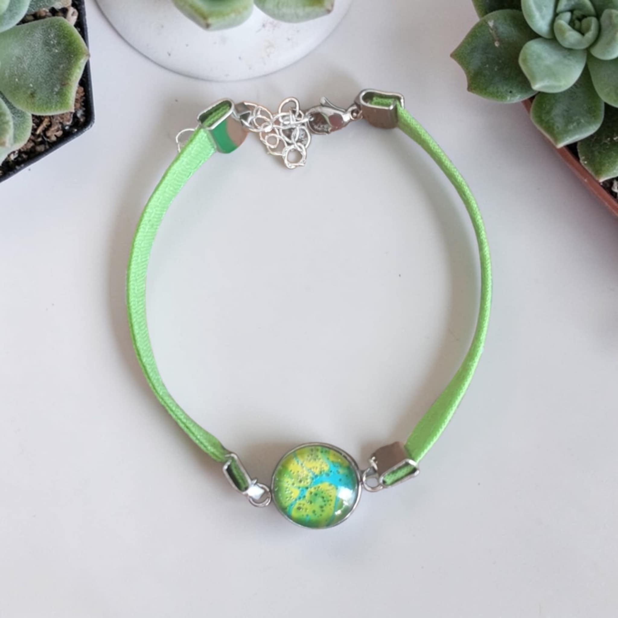 Chaque création étant réalisée à partir d’une peinture originale, les motifs et nuances peuvent légèrement varier, ce qui rend chaque bijou unique.