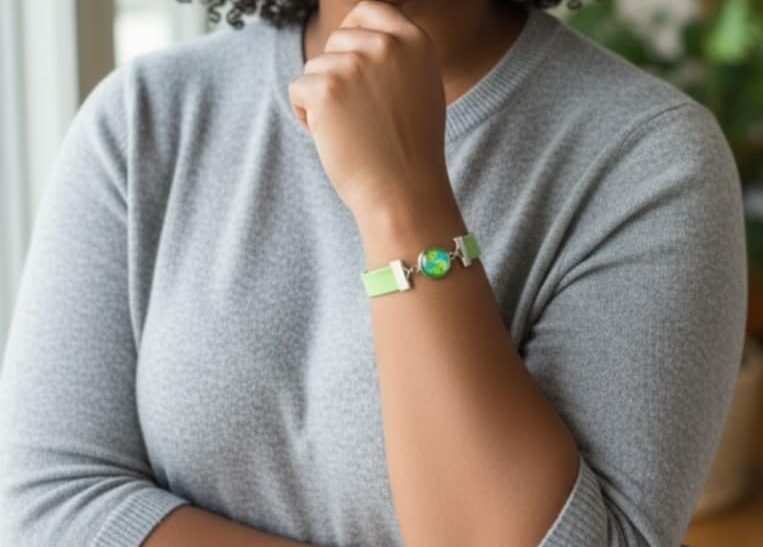 Ce bracelet est également le fruit d’une collaboration artisanale avec Mylcouz’êtes, couturière. Le bijou est monté sur un bracelet en tissu, composé de deux tissus délicatement assemblés, apportant douceur, originalité et confort au porté.