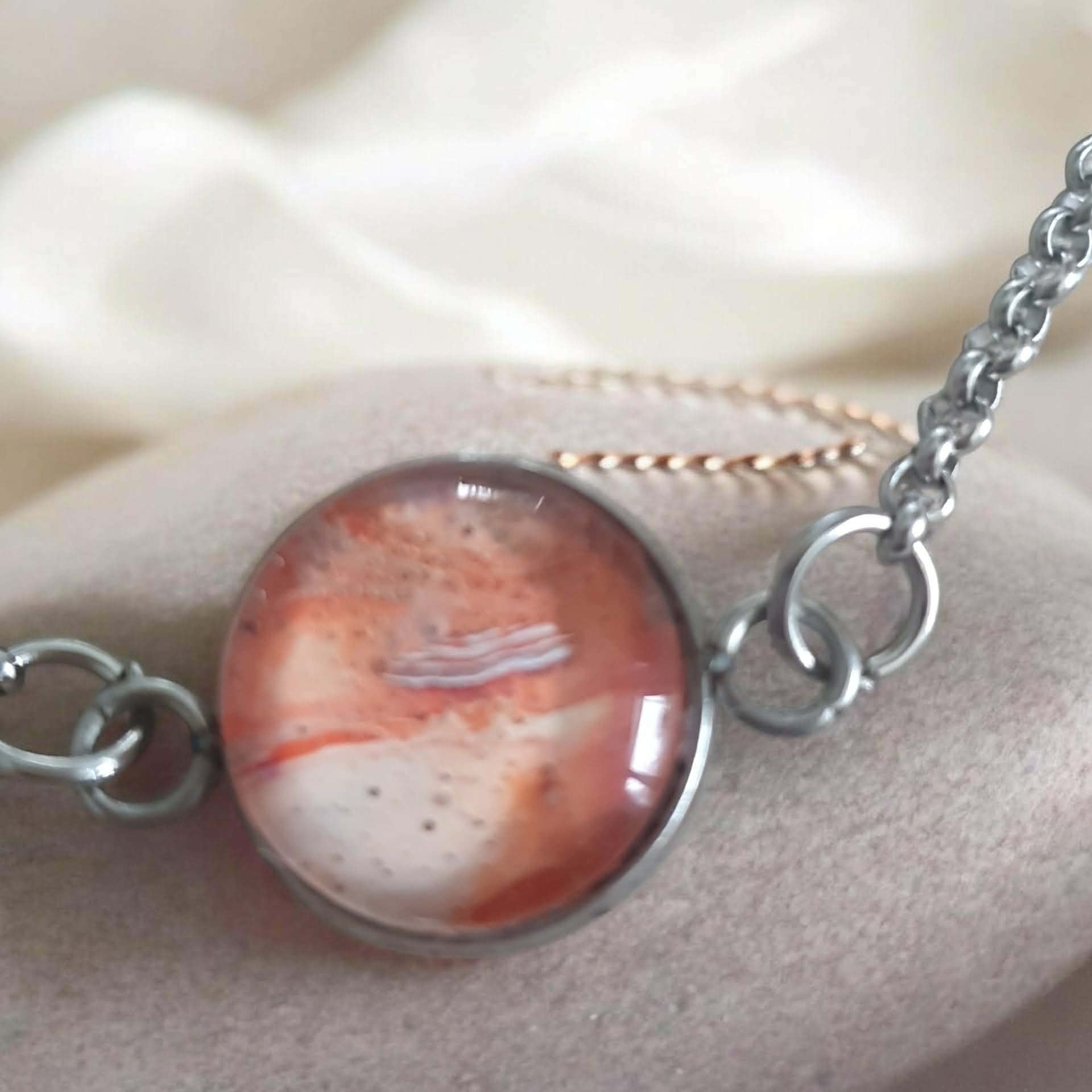 Chaque bijou est réalisé à partir d’un fragment de peinture originale que je crée dans mon atelier. Une partie de l’œuvre est ensuite protégée sous un cabochon en verre afin de préserver la profondeur et les nuances de la peinture.