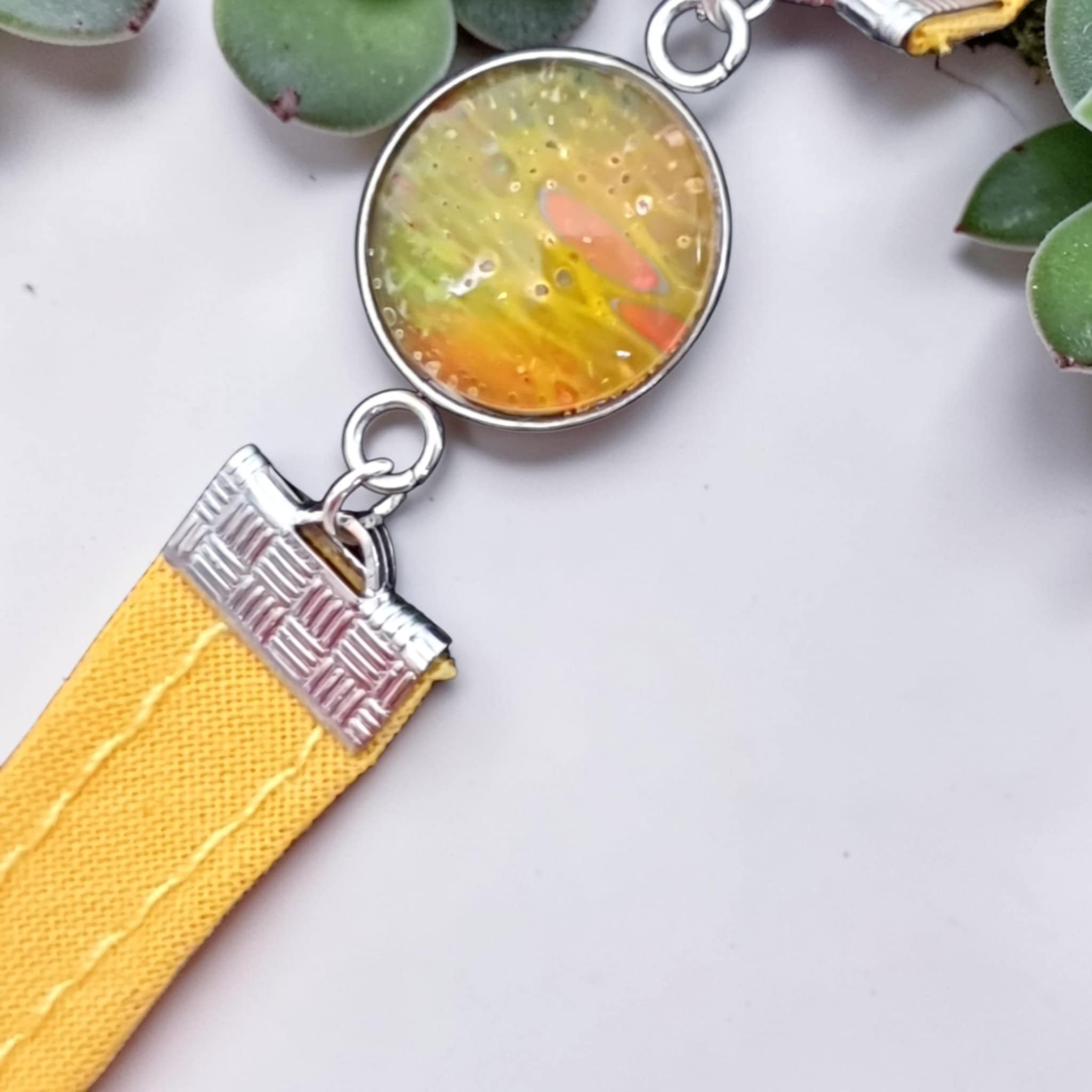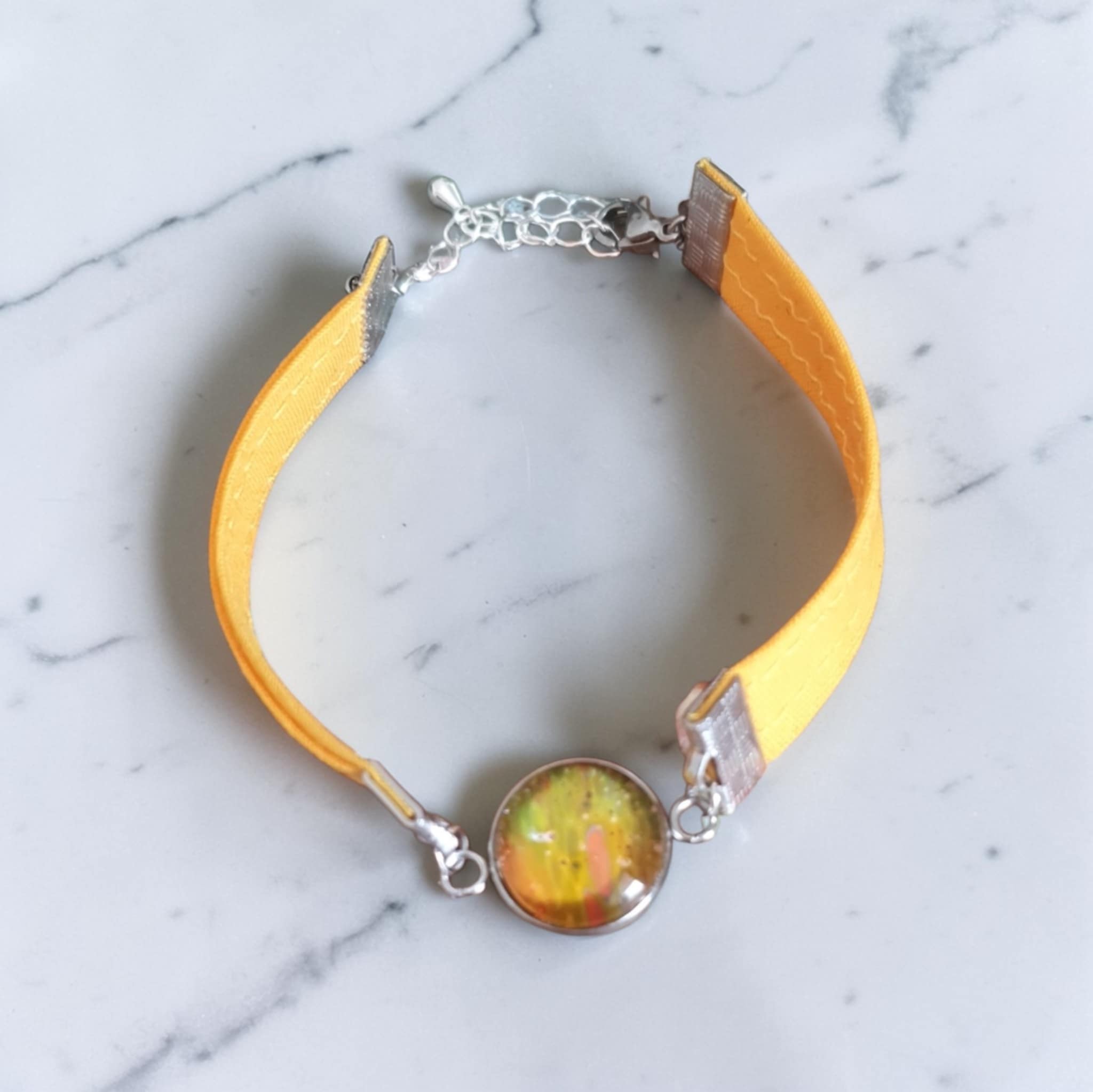 Le bracelet L’éveil Solaire est une création artistique inspirée par la lumière et la chaleur des premiers rayons du soleil. Les nuances de jaune se mêlent délicatement à de subtiles touches de rose et de vert grâce à la technique du pouring, créant des effets fluides et organiques qui évoquent la nature qui s’éveille et la douceur d’un matin lumineux.