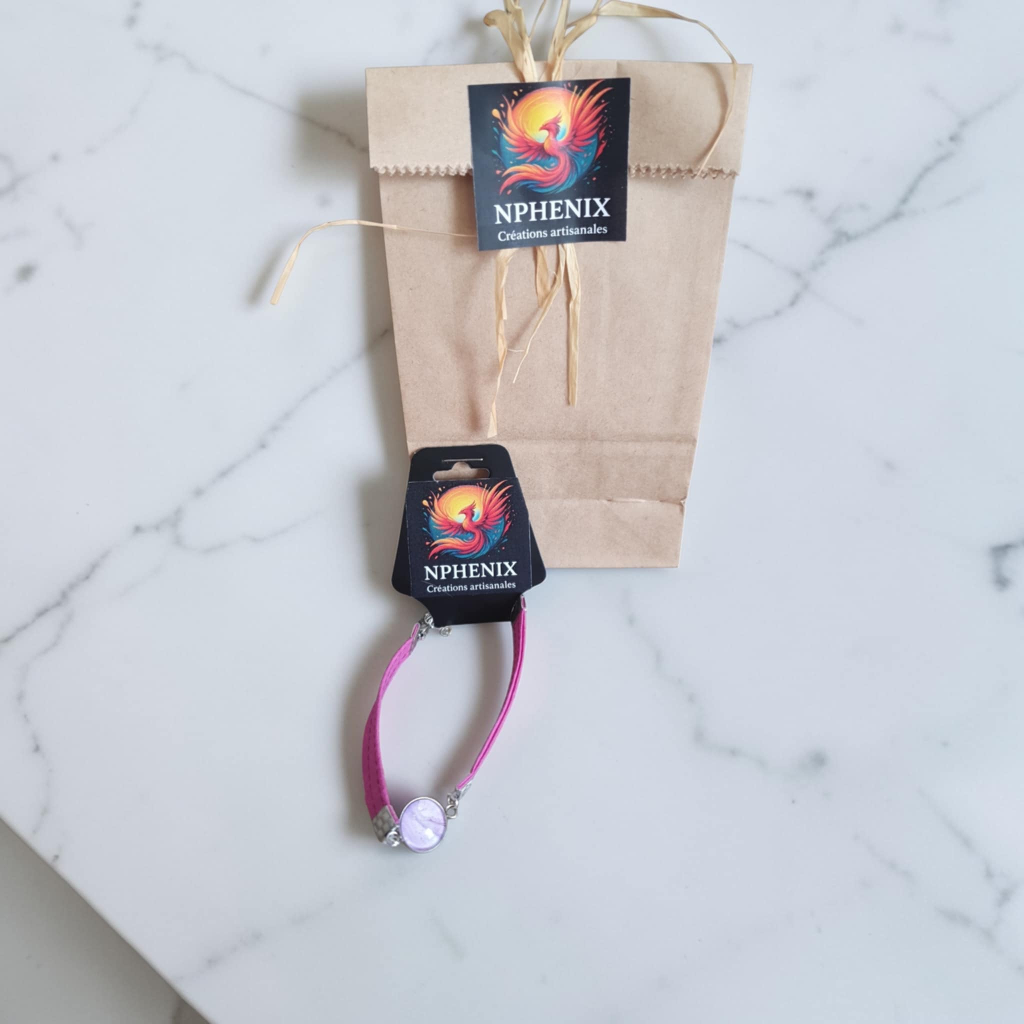 Ce bracelet est également le fruit d’une collaboration artisanale avec Mylcouz’êtes, couturière. Le bijou est monté sur un bracelet en tissu, composé de deux tissus délicatement assemblés, apportant douceur, originalité et confort au porté.