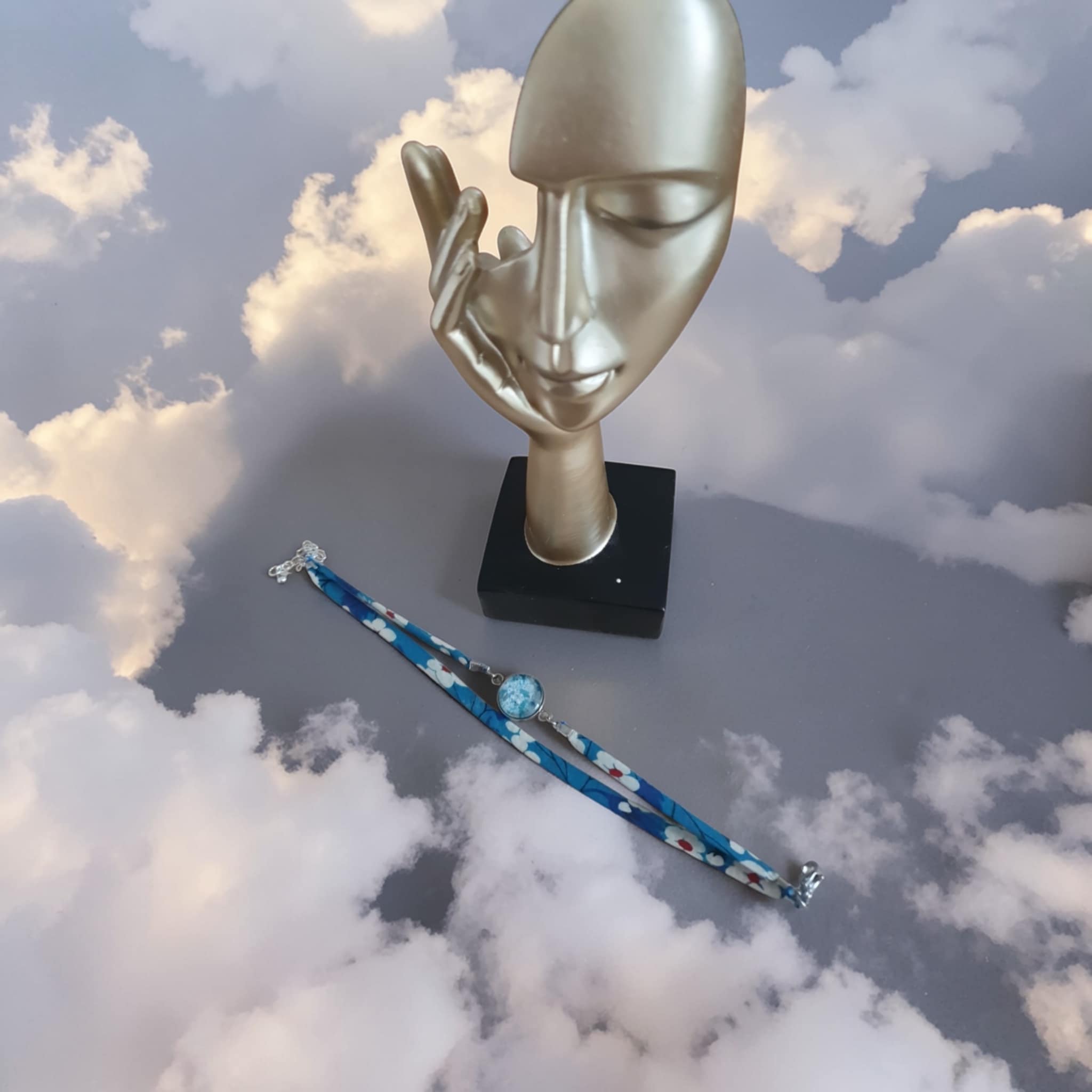 Ce bracelet est également le fruit d’une collaboration artisanale avec Mylcouz’êtes, couturière. Le bijou est monté sur un bracelet en tissu, composé de deux tissus délicatement assemblés, apportant douceur, originalité et confort au porté.