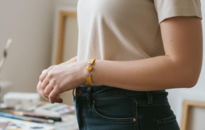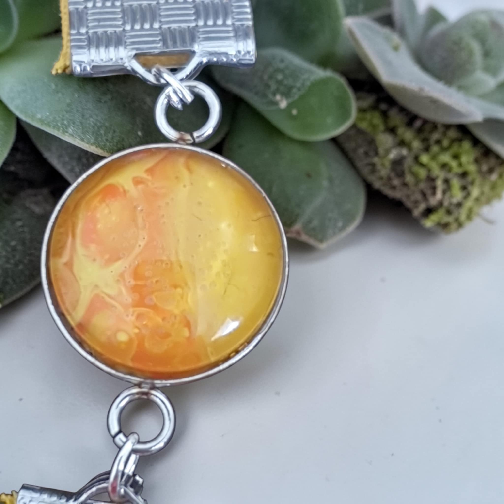 Le bracelet Soleil est une création artistique inspirée par la chaleur et l’énergie du soleil. Les nuances de jaune et d’orange se mêlent harmonieusement grâce à la technique du pouring, créant des effets fluides et lumineux qui évoquent les rayons du soleil et la douceur des journées ensoleillées. Le bracelet en tissu, entièrement jaune, vient sublimer cette création en apportant une touche de lumière et de simplicité, pour un bijou à la fois éclatant, chaleureux et plein de vitalité.