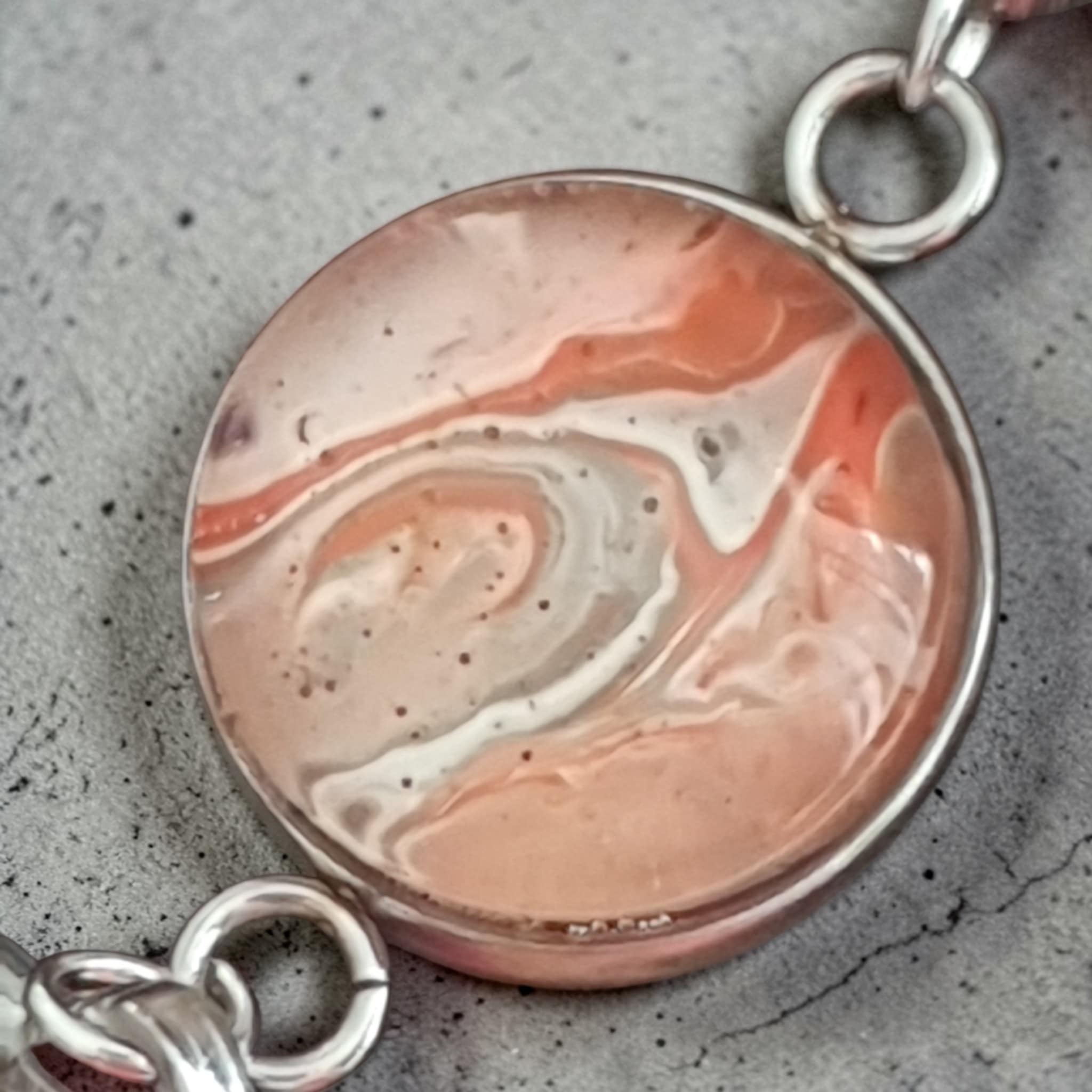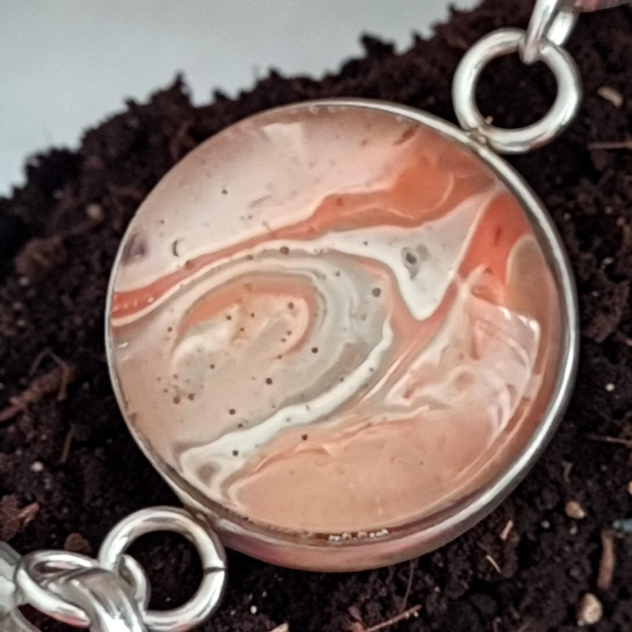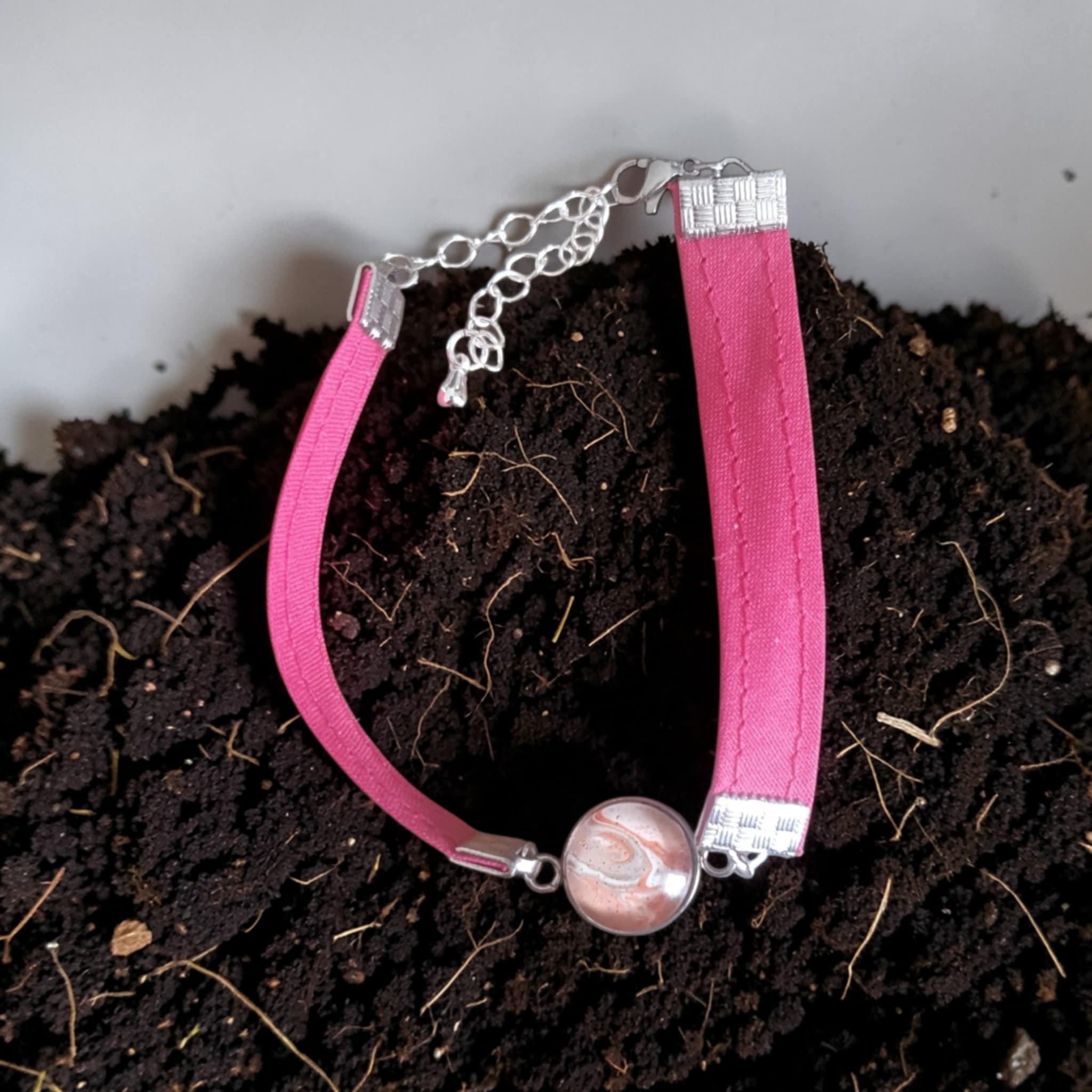 Le bracelet Terre Battue est une création artistique inspirée par la matière et les teintes naturelles de la terre. Les nuances de rose, mêlées à des tons brun et à des touches de blanc, se déploient grâce à la technique du pouring, créant des effets fluides et organiques qui évoquent les sols naturels et les textures minérales. Le bracelet en tissu, dans des tons roses, apporte une touche de douceur et de contraste, pour un bijou à la fois chaleureux, délicat et contemporain.