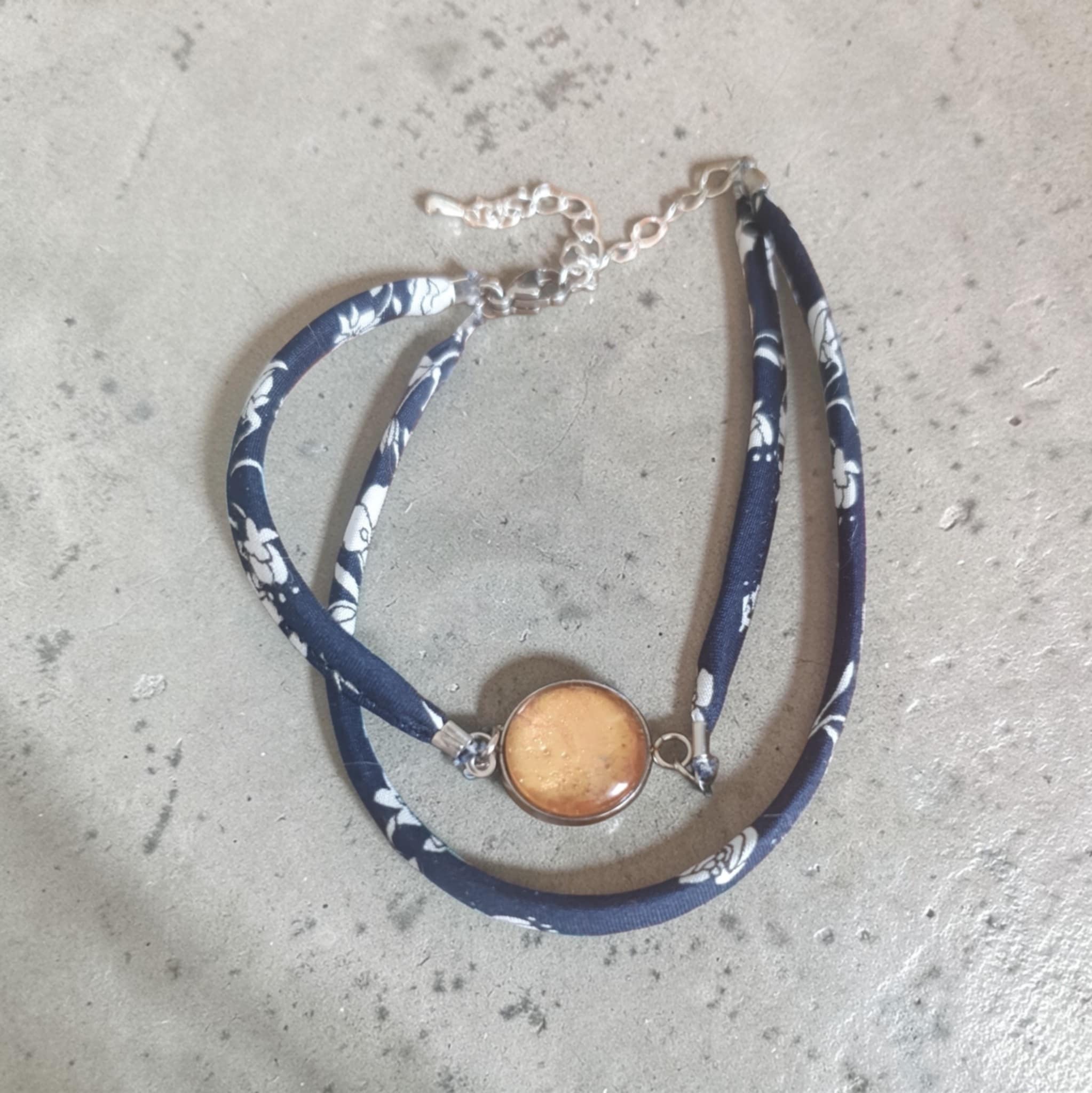 Ce bracelet est également le fruit d’une collaboration artisanale avec Mylcouz’êtes, couturière. Le bijou est monté sur un bracelet en tissu, composé de deux tissus délicatement assemblés, apportant douceur, originalité et confort au porté.