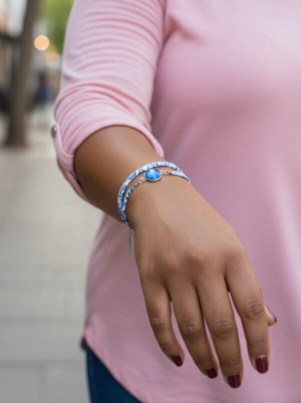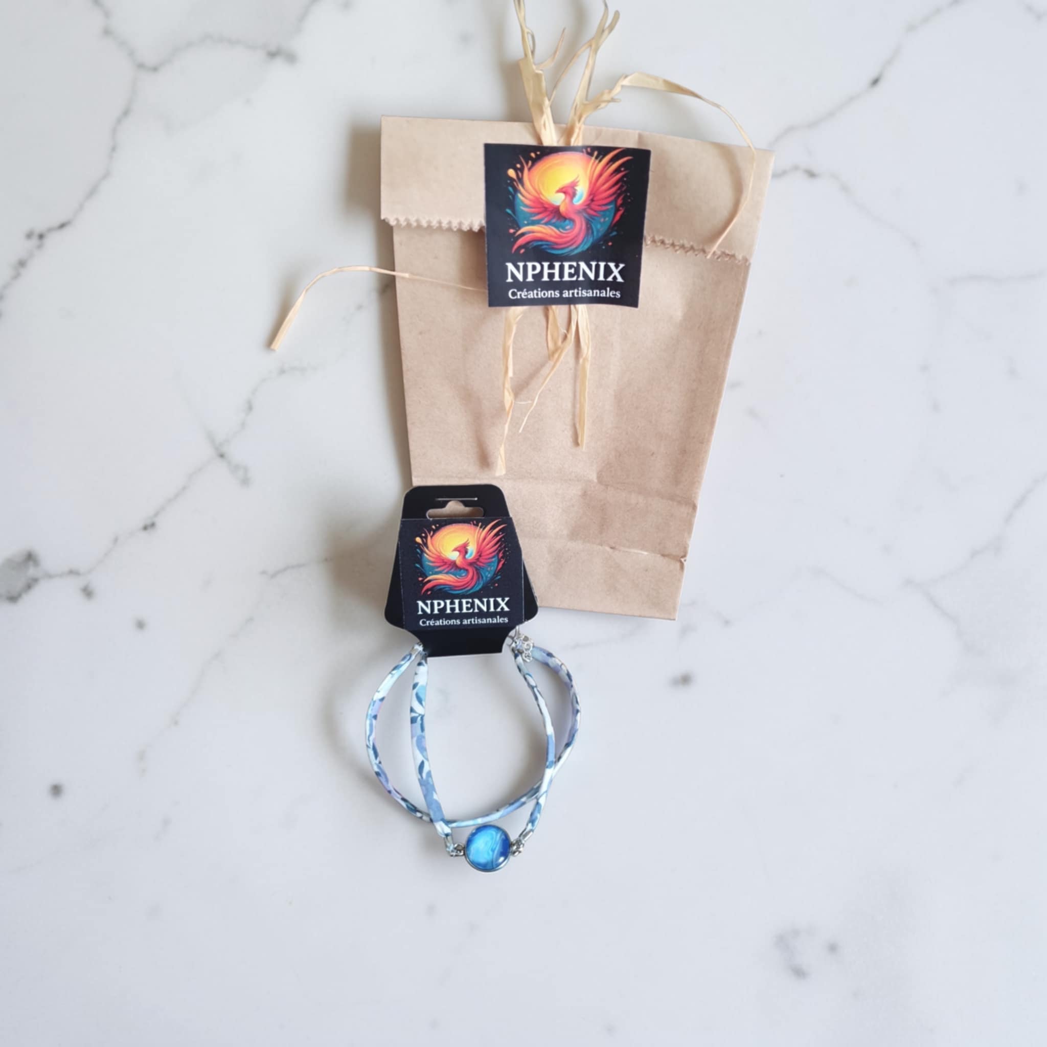 Ce bracelet est également le fruit d’une collaboration artisanale avec Mylcouz’êtes, couturière. Le bijou est monté sur un bracelet en tissu, composé de deux tissus délicatement assemblés, apportant douceur, originalité et confort au porté.