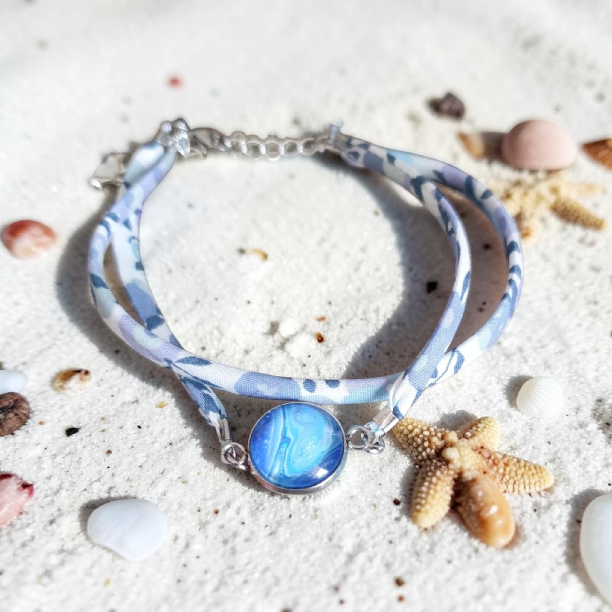 Le bracelet Vague Bleue est une création artistique inspirée par le mouvement et la fraîcheur de l’océan. Les nuances de bleu se mêlent harmonieusement grâce à la technique du pouring, créant des effets fluides et organiques qui évoquent les vagues et les courants marins. Le bracelet en tissu, dans des tons de bleu et de blanc, vient compléter cette création en apportant douceur et légèreté, pour un bijou à la fois apaisant, élégant et contemporain.