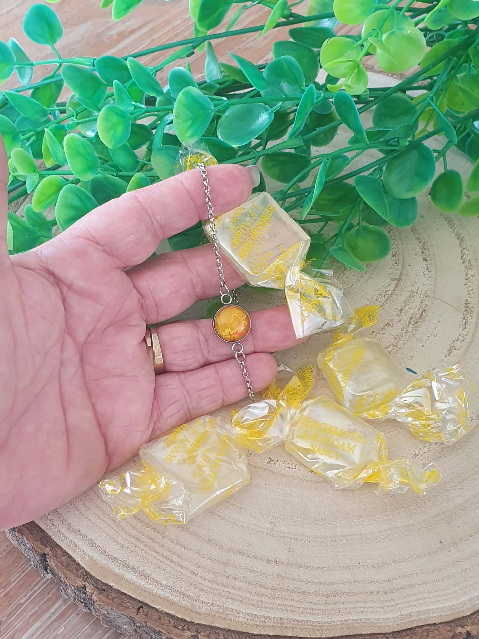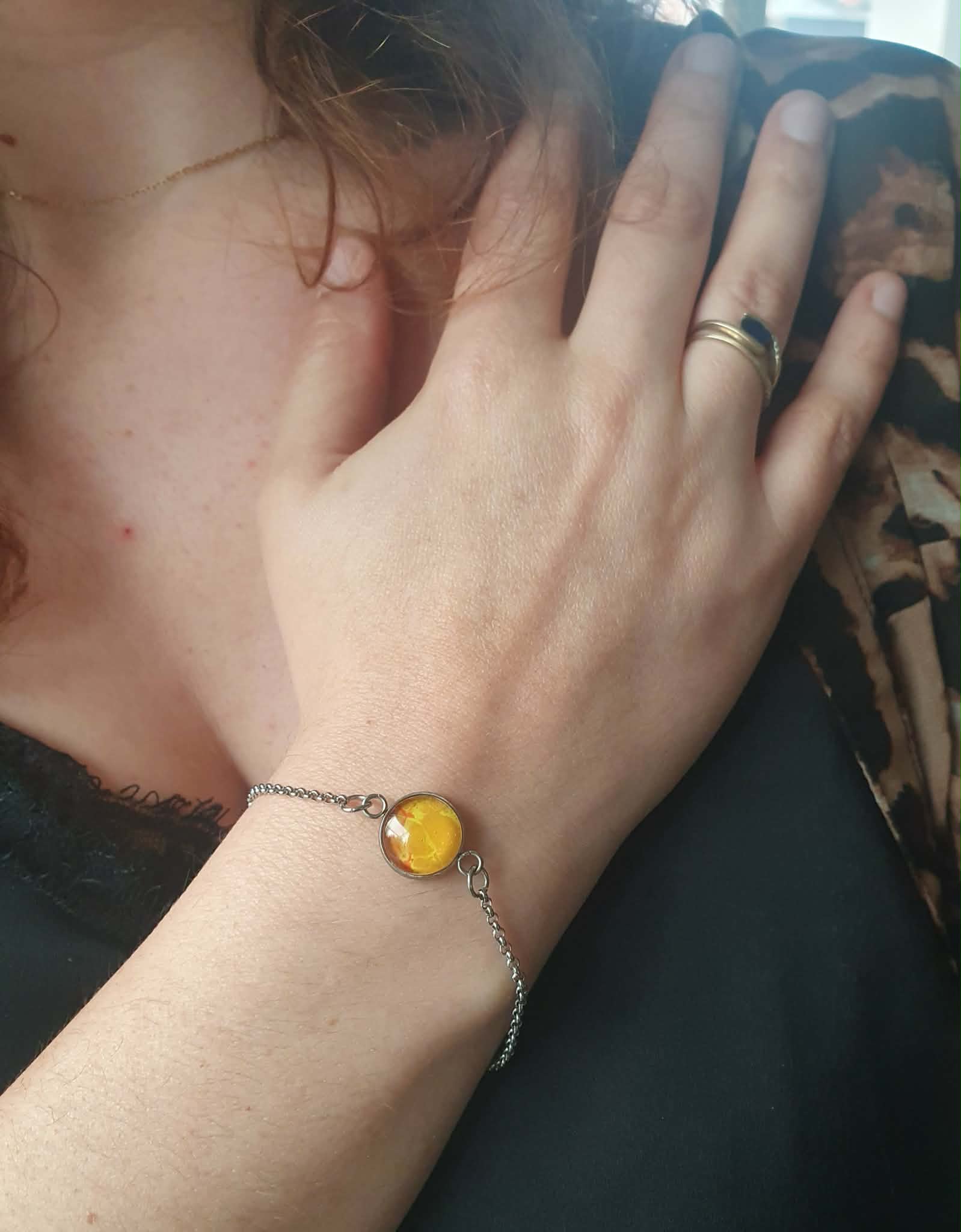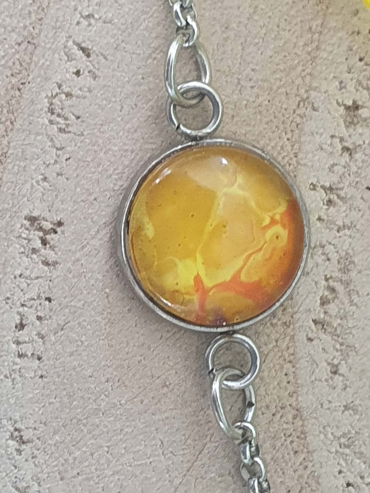 Le jaune vibrant de la peinture, protégé sous un cabochon en verre, capte la lumière et apporte une touche de soleil et de gaité à chaque mouvement.