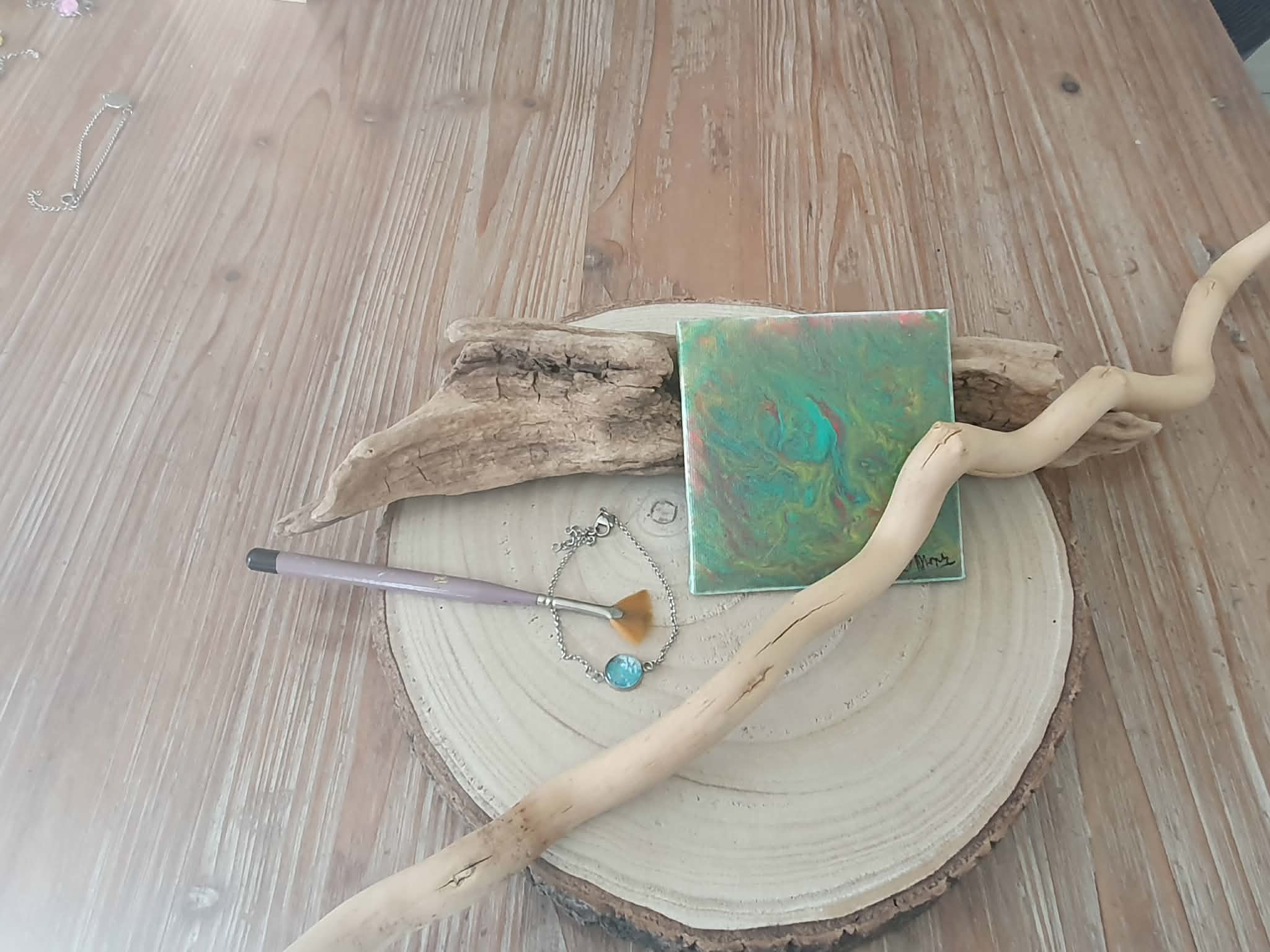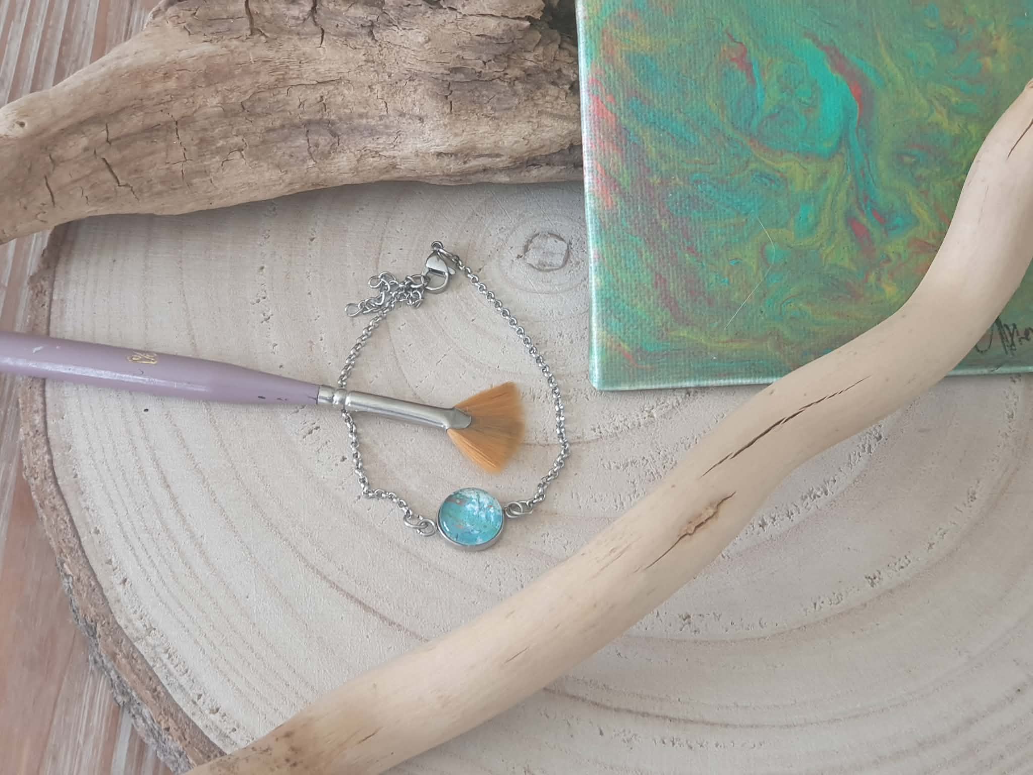 Chaque création étant réalisée à partir d’une peinture originale, les motifs et nuances peuvent légèrement varier, ce qui rend chaque bijou unique.