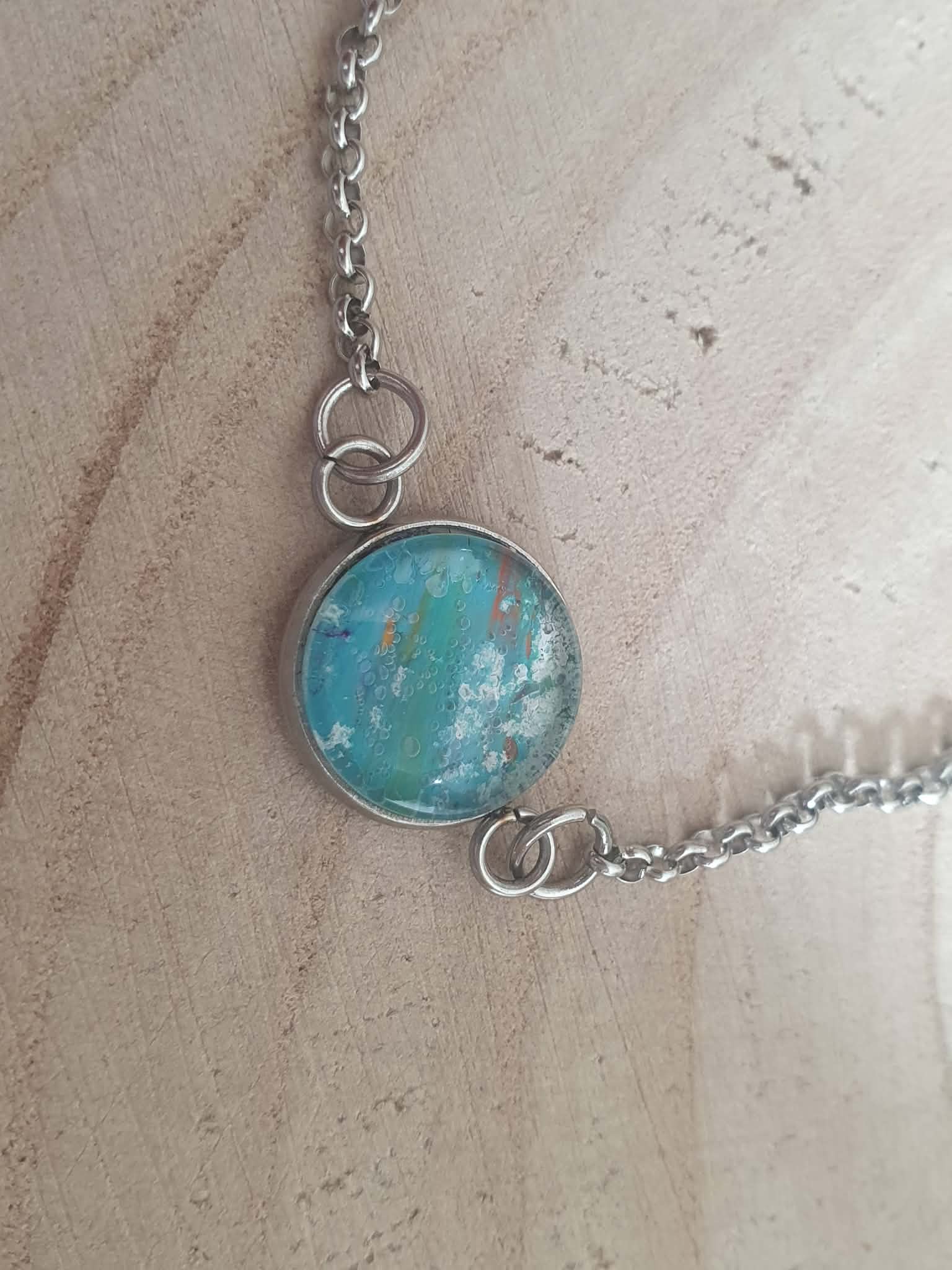 Les nuances de bleu mêlées à de subtils reflets verts s’accordent avec l’éclat argenté du métal pour créer un bijou apaisant, évoquant un paysage vivant et harmonieux.