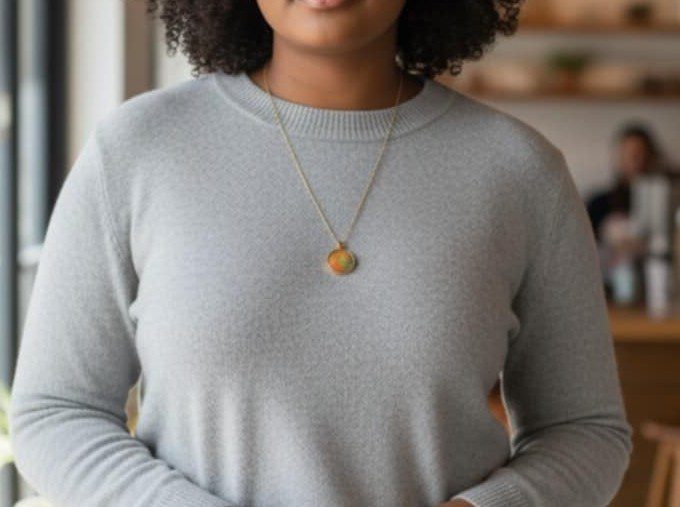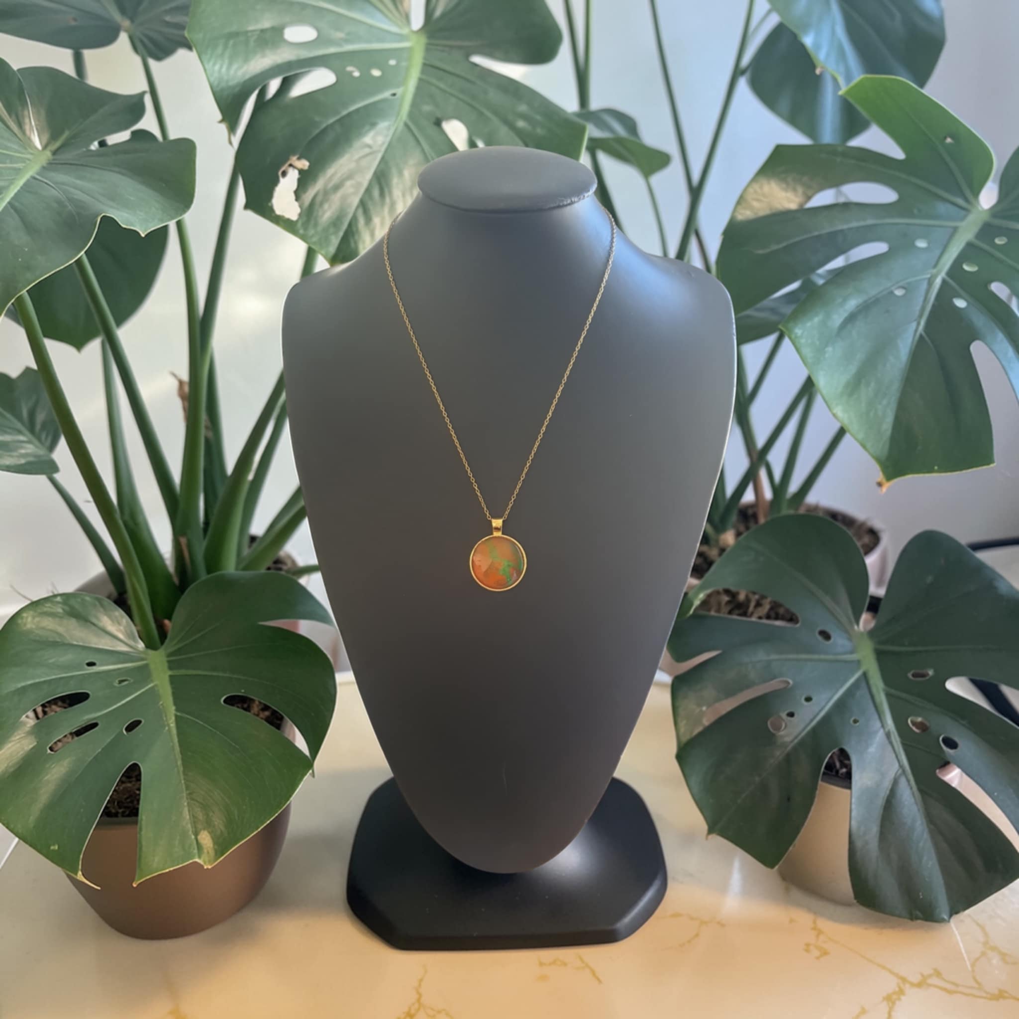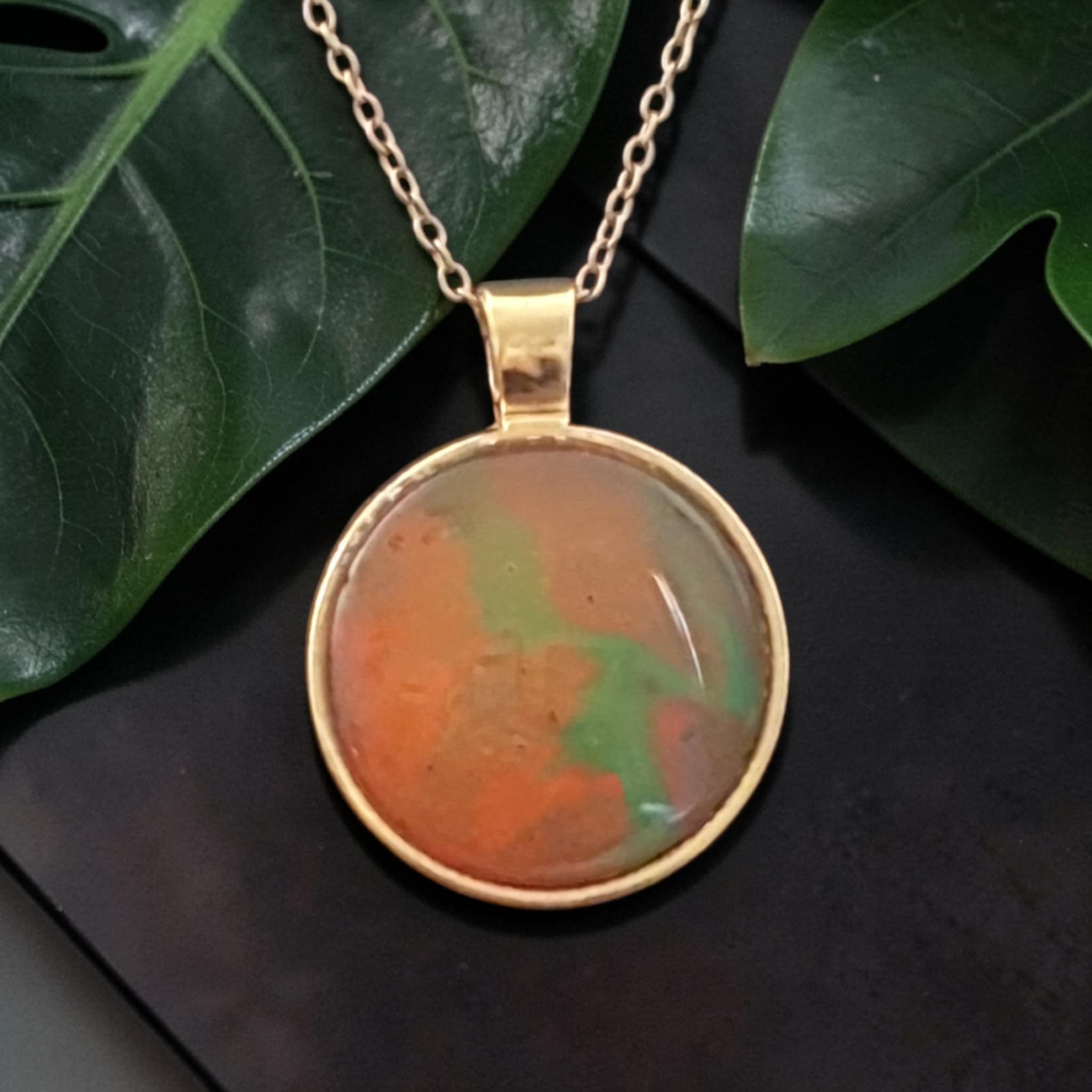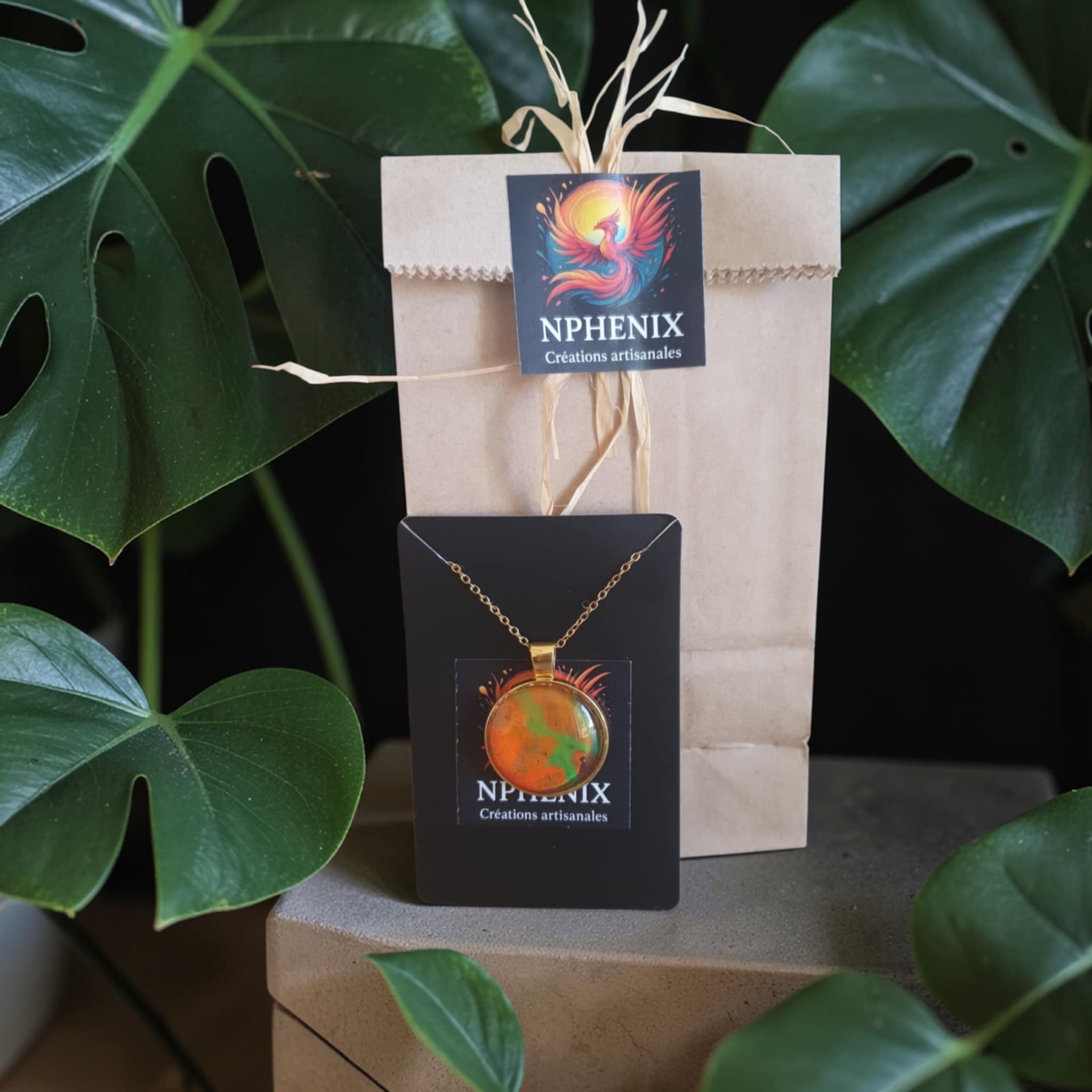 Le collier Chemin de Rivière est une création artistique inspirée par les paysages naturels et les cours d’eau. Les nuances d’orange et de vert se mêlent harmonieusement grâce à la technique du pouring, créant des effets fluides et organiques qui évoquent un chemin sinueux au cœur de la nature. Le support doré apporte une touche de lumière et d’élégance.