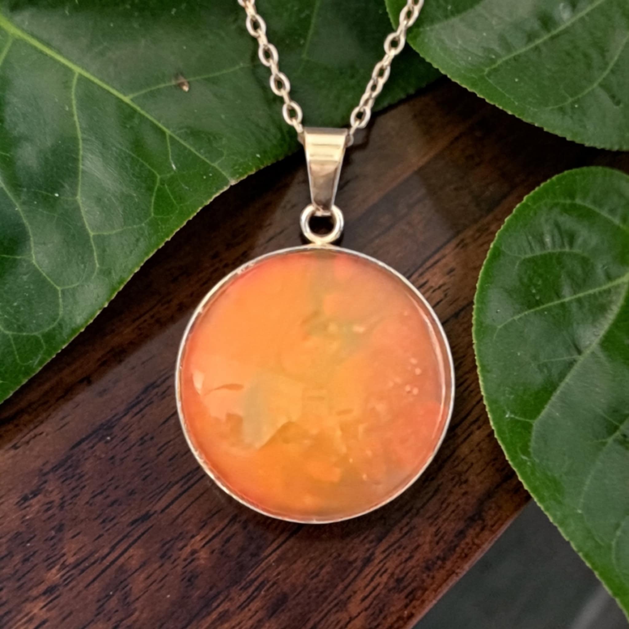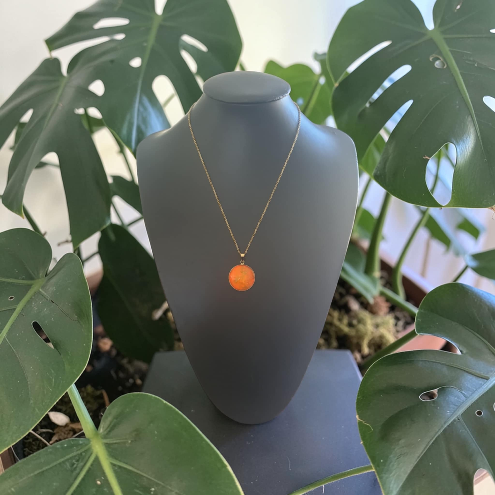 Le collier Lueurs orangées est une création artistique inspirée par la chaleur et la lumière. Les nuances d’orange se déploient grâce à la technique du pouring, créant des effets fluides et lumineux qui évoquent les reflets d’un coucher de soleil. Le support doré renforce l’éclat de la création et lui confère une touche chaleureuse et précieuse.