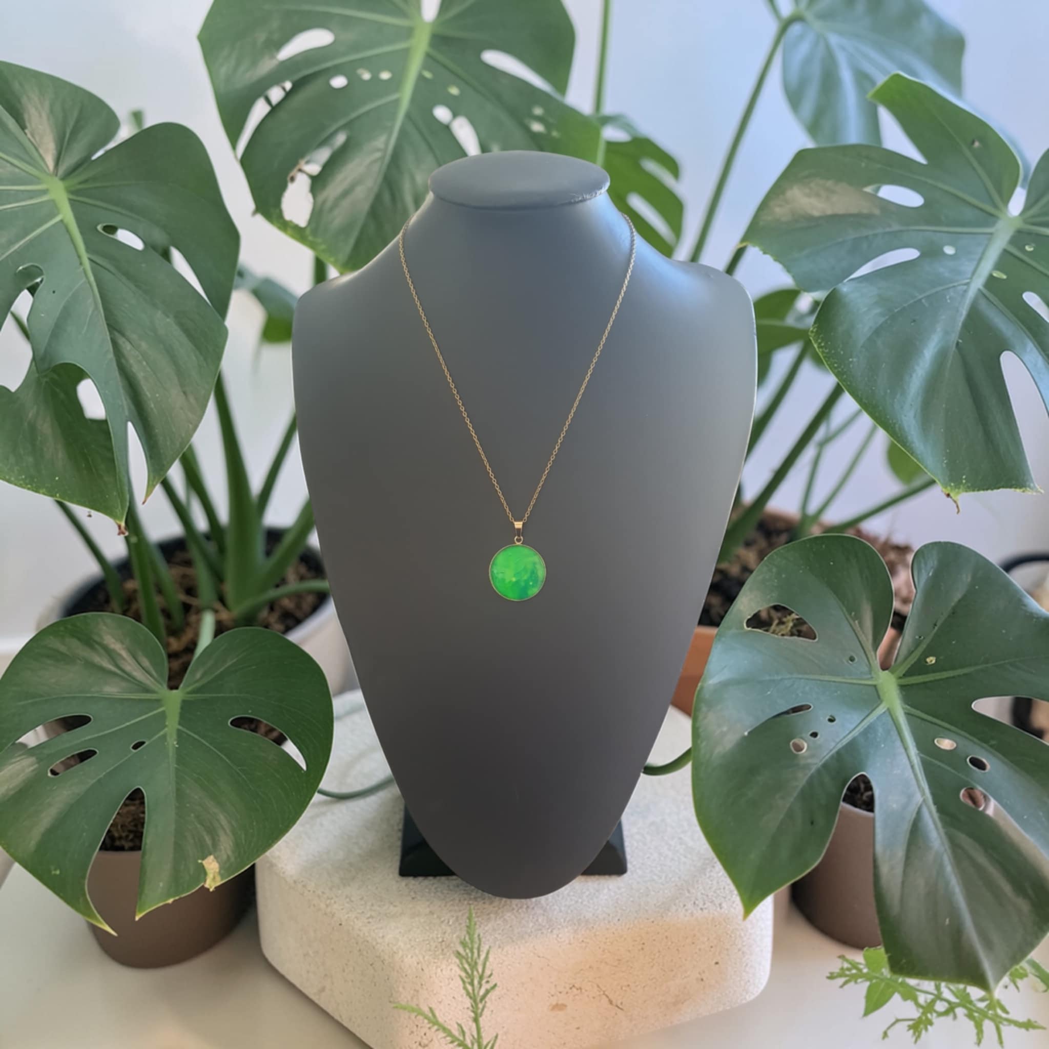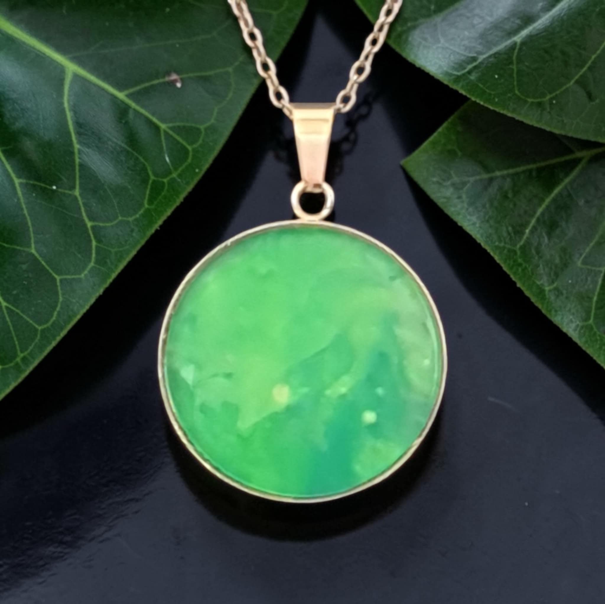Le collier Méandre Sauvage est une création artistique inspirée par les formes libres et naturelles. Les nuances de vert se déploient grâce à la technique du pouring, créant des effets fluides et organiques qui évoquent la végétation et les mouvements naturels. Le support doré vient sublimer l’ensemble avec une touche lumineuse et raffinée.