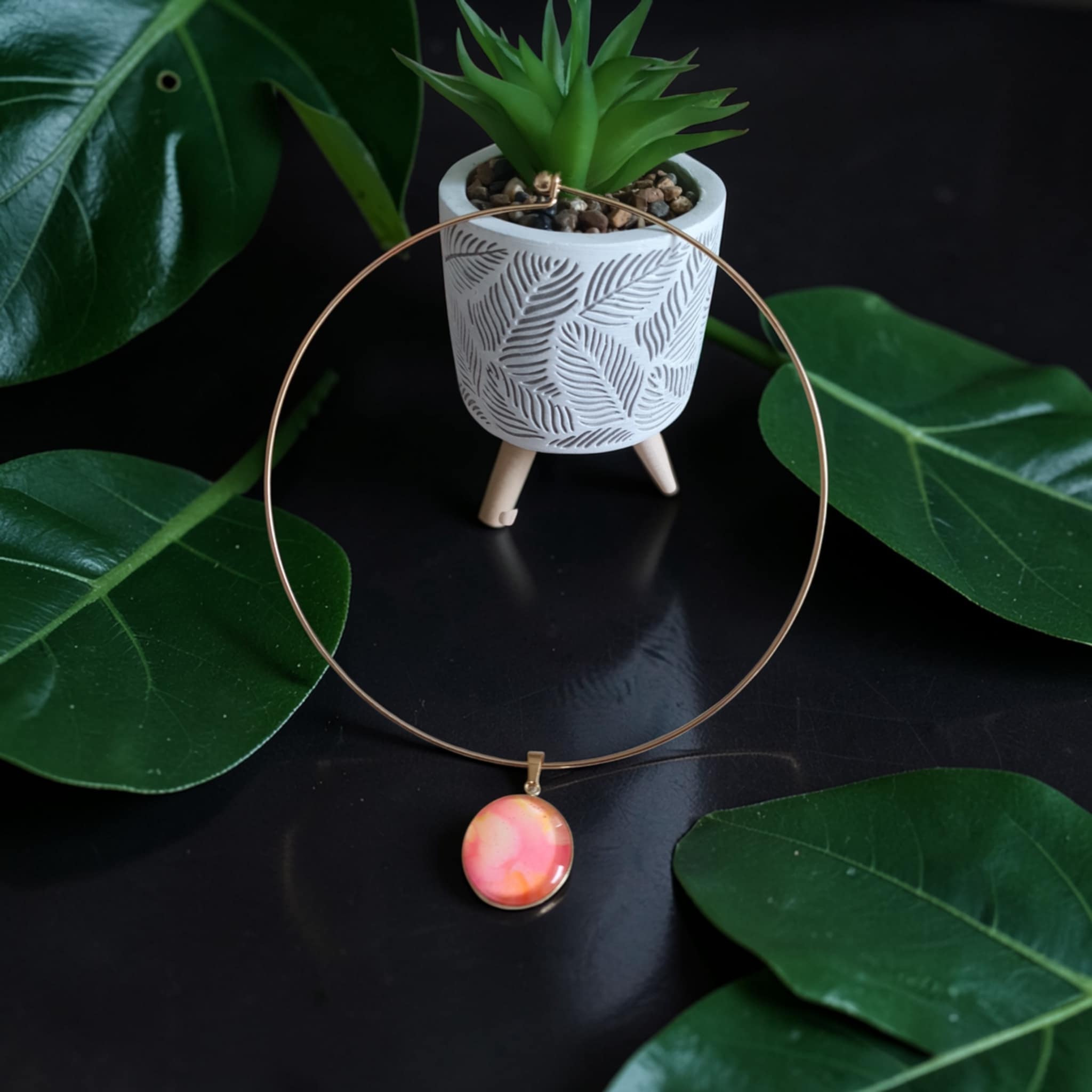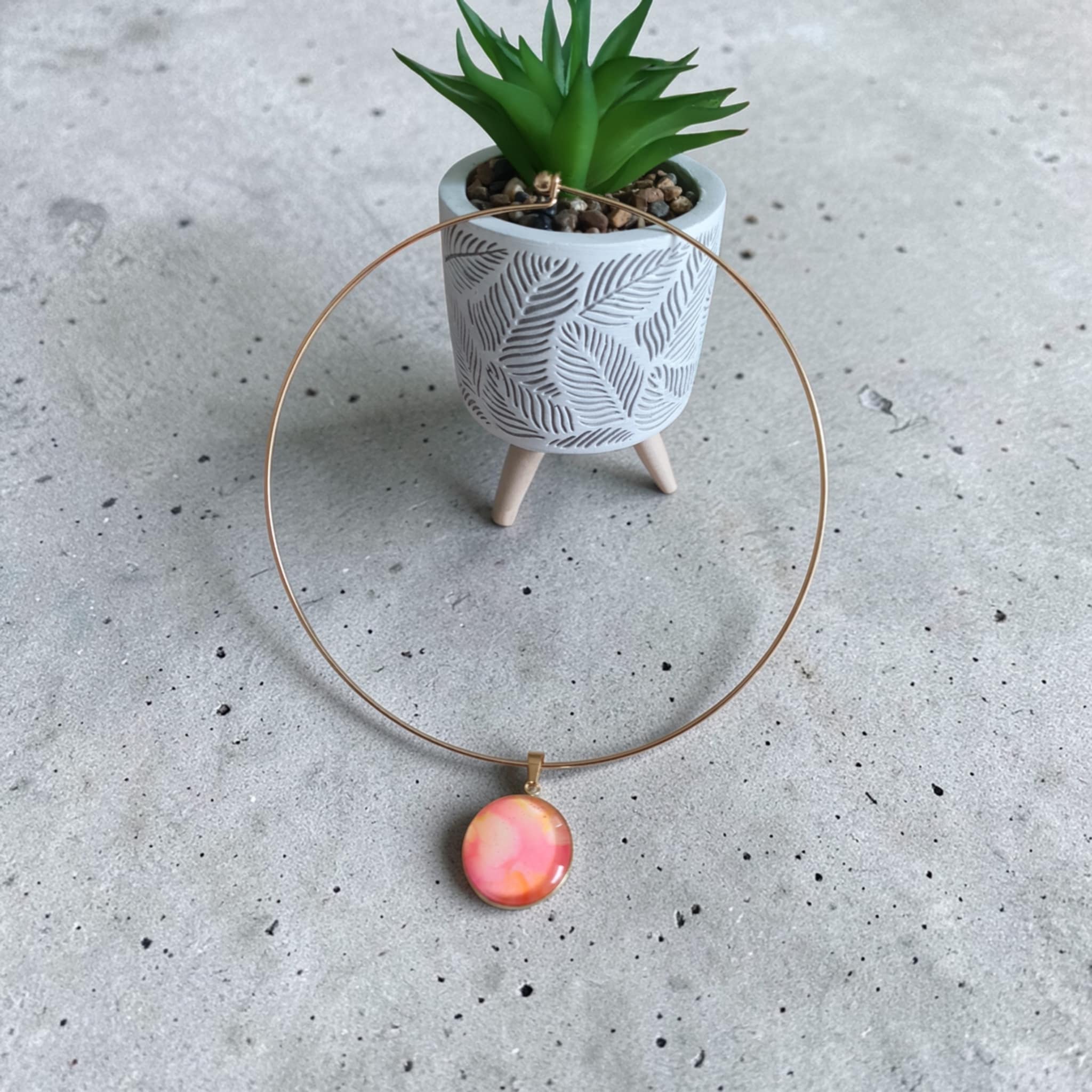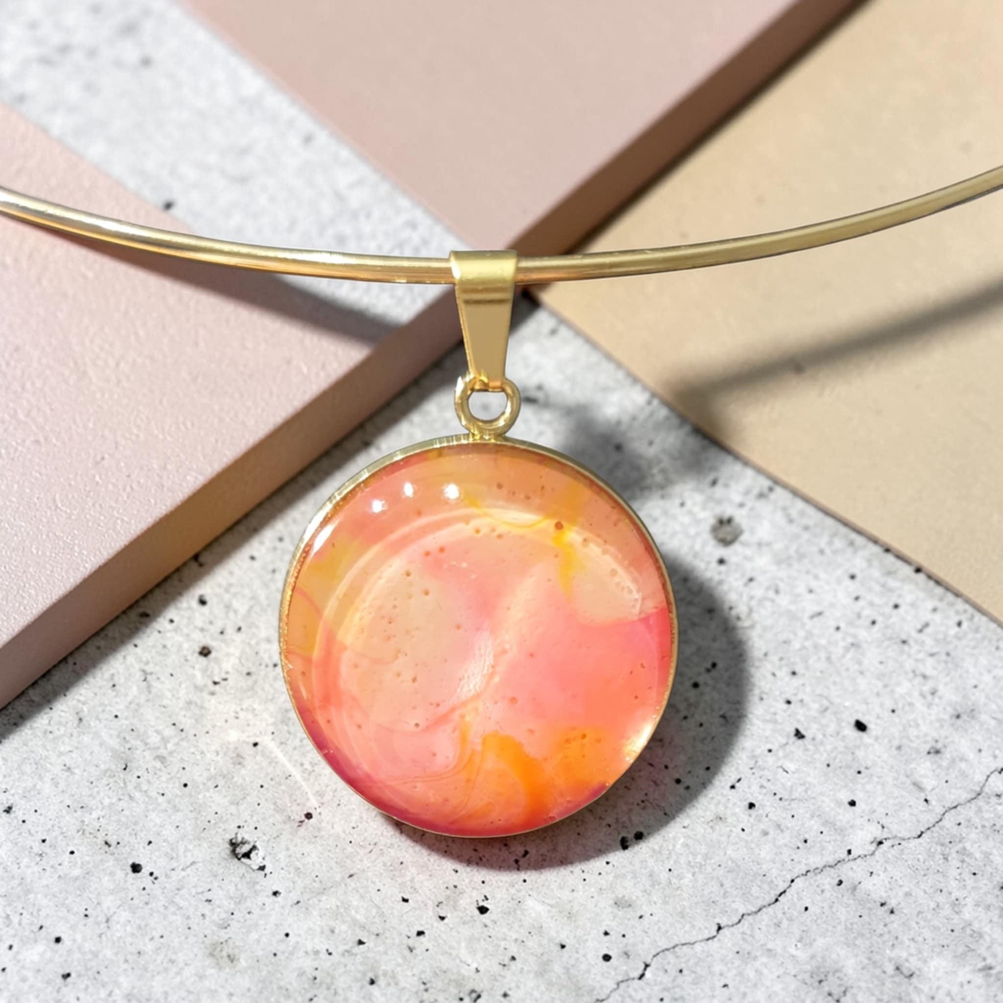 Le collier Tulipe est une création artistique inspirée par la douceur et l’éclat des fleurs printanières. Les nuances de rose et d’orange se mêlent harmonieusement grâce à la technique du pouring, créant des effets fluides et lumineux qui évoquent les pétales d’une tulipe en pleine floraison et la chaleur des beaux jours. Le support doré vient sublimer les couleurs et apporter une touche élégante et lumineuse à l’ensemble.