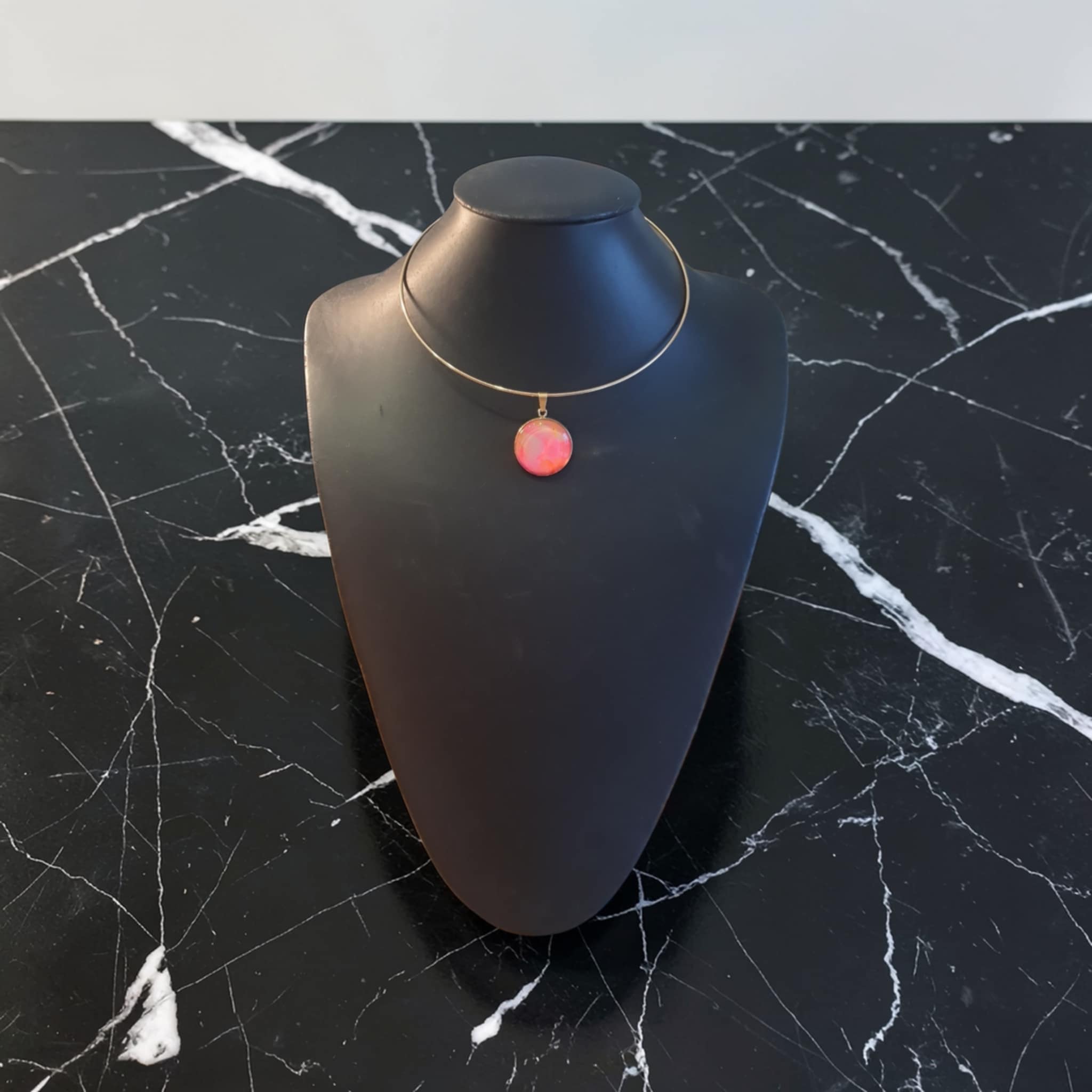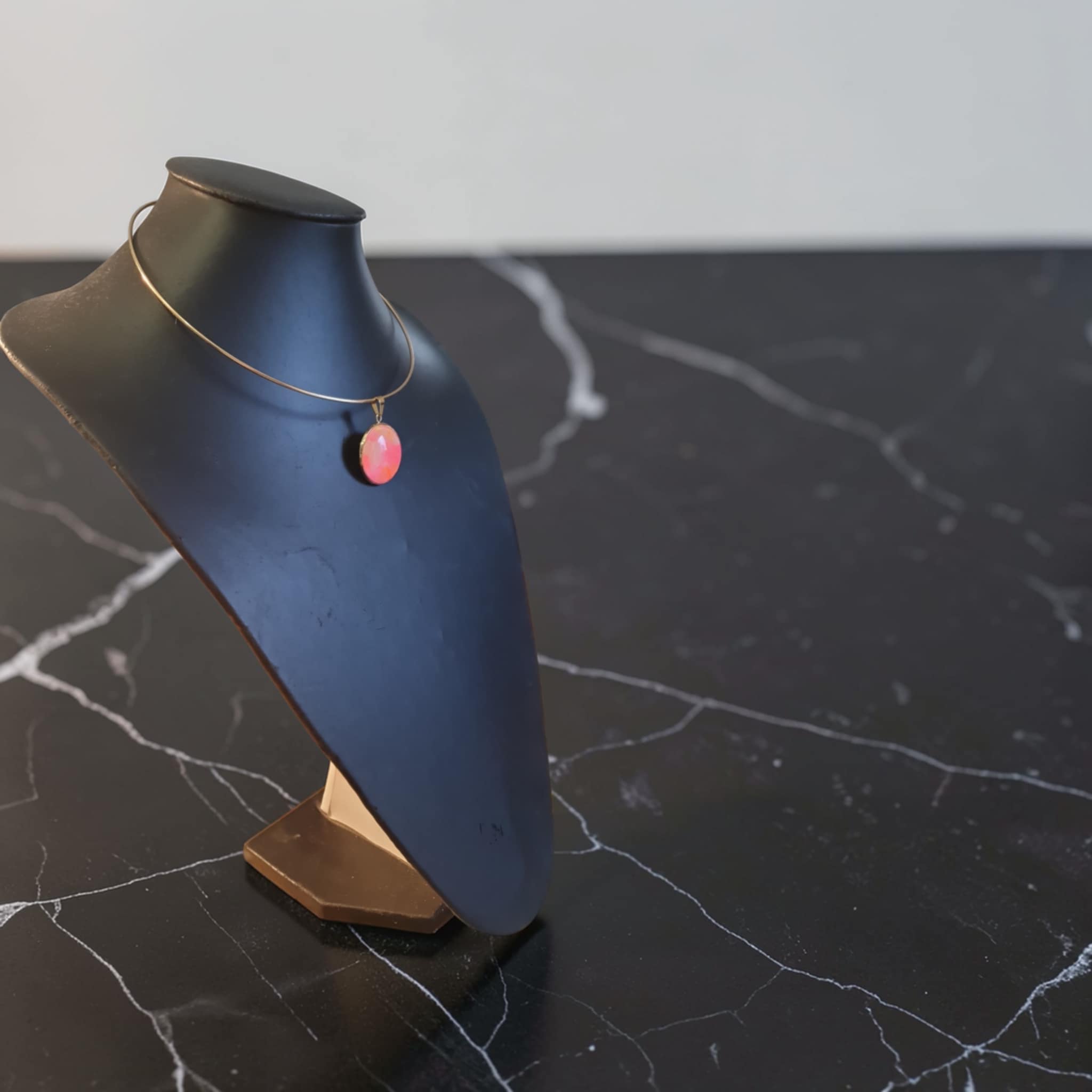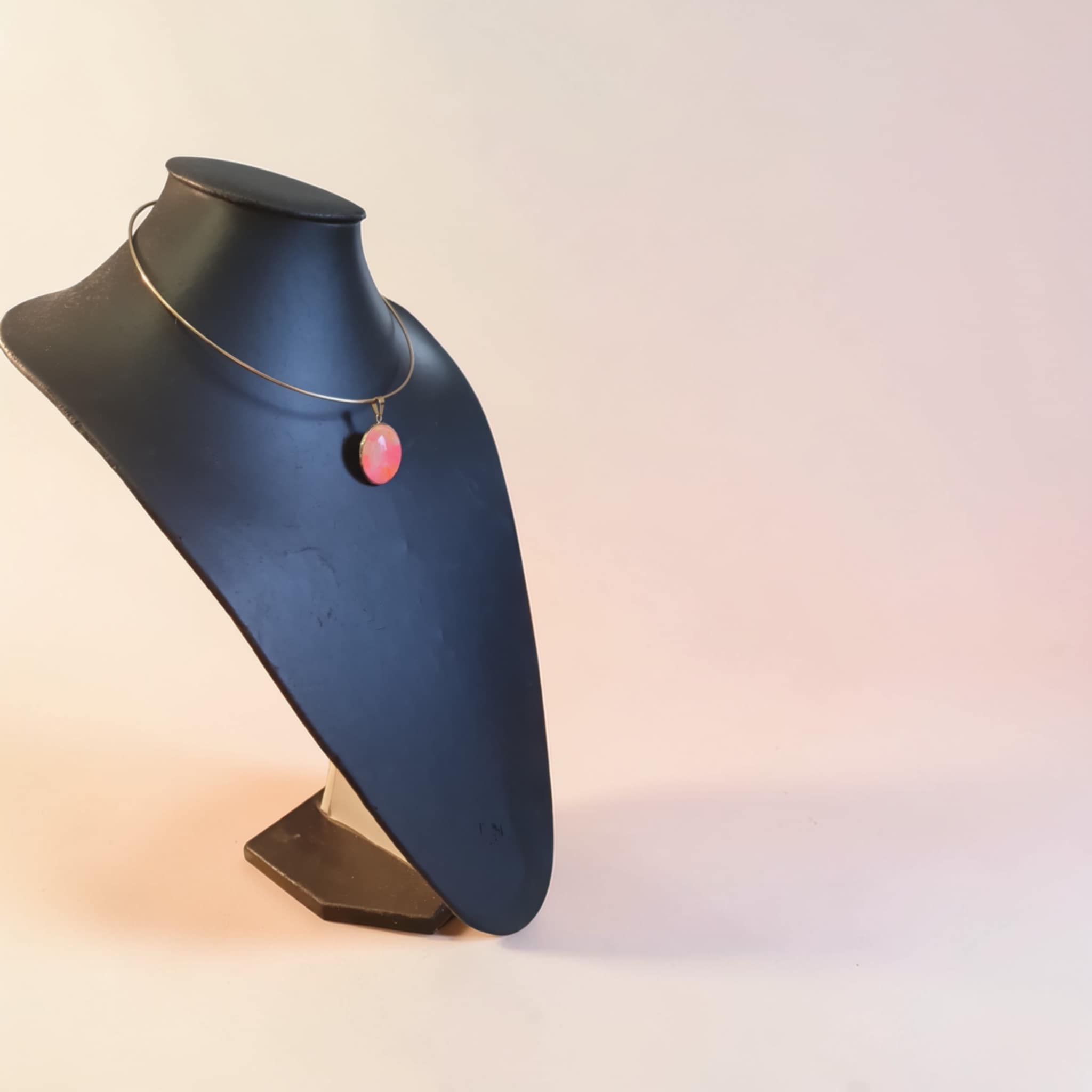 Le collier Tulipe est une création artistique inspirée par la douceur et l’éclat des fleurs printanières. Les nuances de rose et d’orange se mêlent harmonieusement grâce à la technique du pouring, créant des effets fluides et lumineux qui évoquent les pétales d’une tulipe en pleine floraison et la chaleur des beaux jours. Le support doré vient sublimer les couleurs et apporter une touche élégante et lumineuse à l’ensemble.