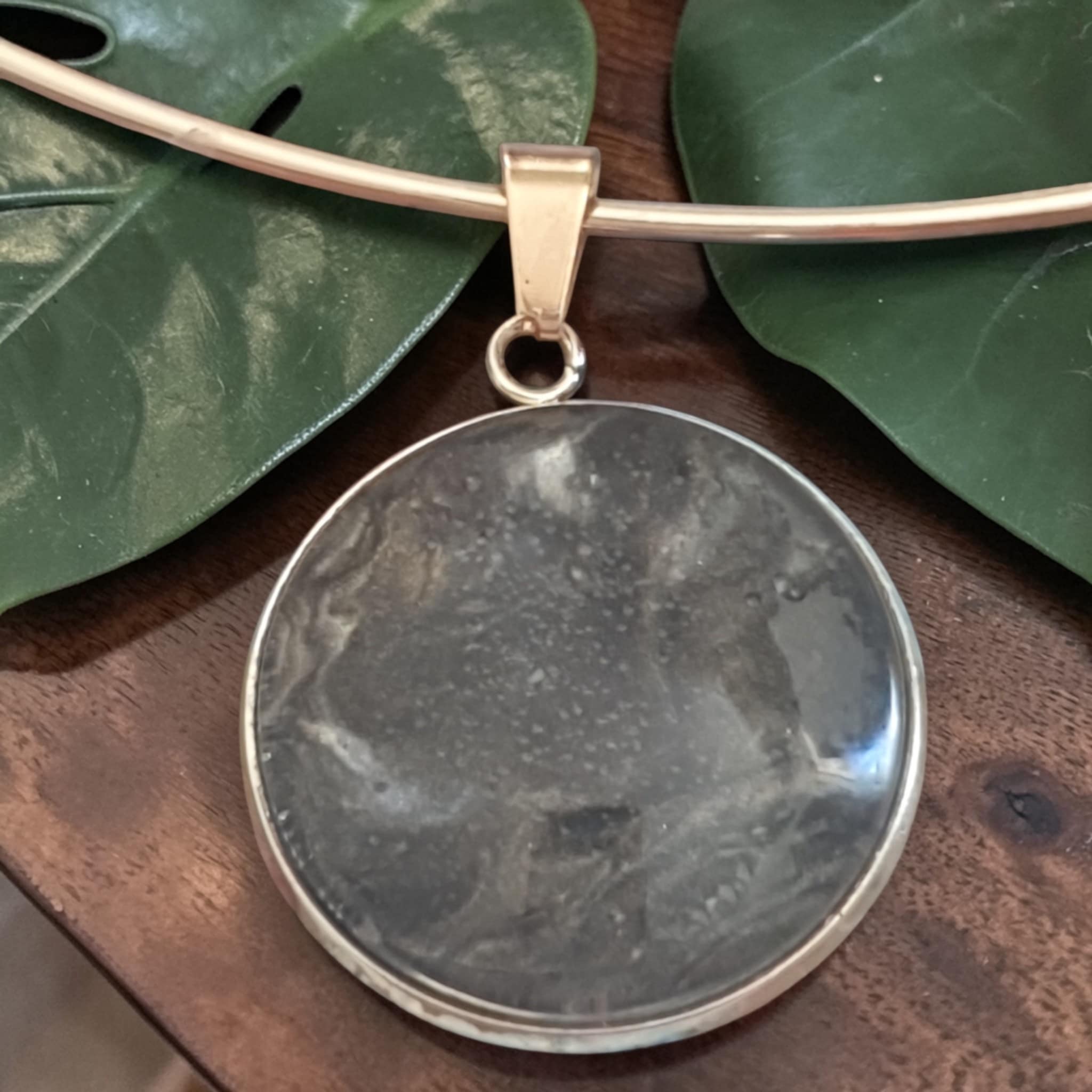 Le collier Éclipse est une création artistique inspirée par la puissance et le mystère des phénomènes célestes. Les nuances de noir se déploient grâce à la technique du pouring, créant des effets profonds et organiques qui évoquent l’ombre, la lumière et l’intensité d’une éclipse.