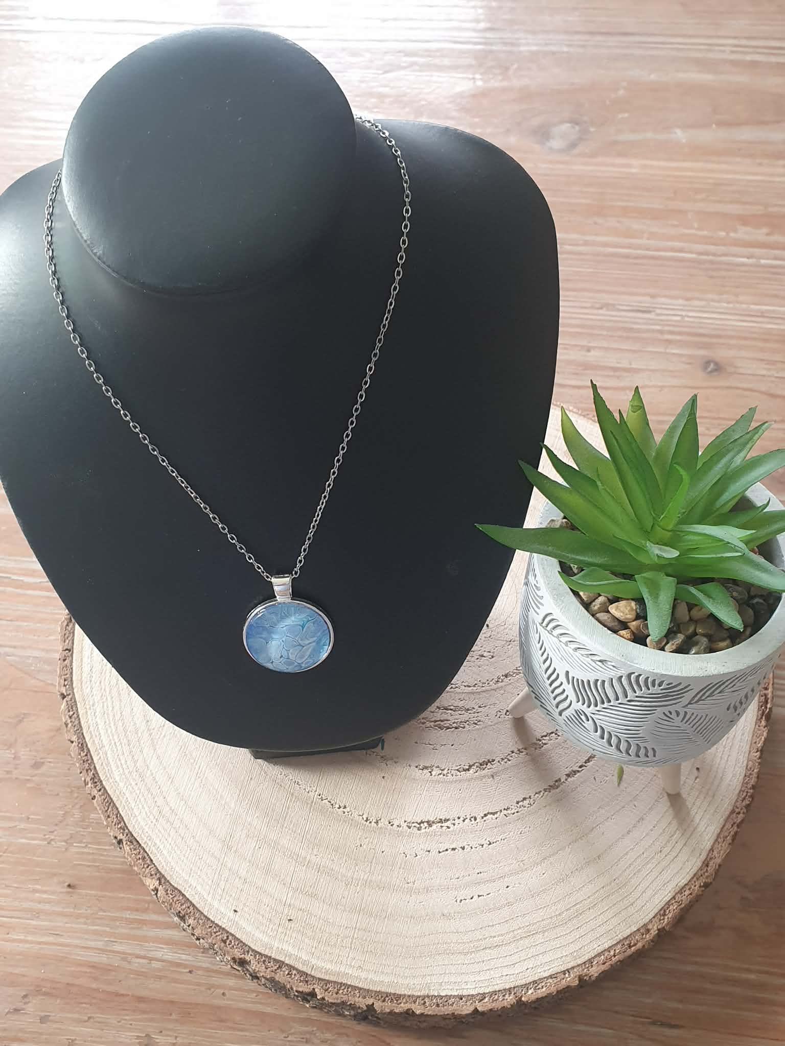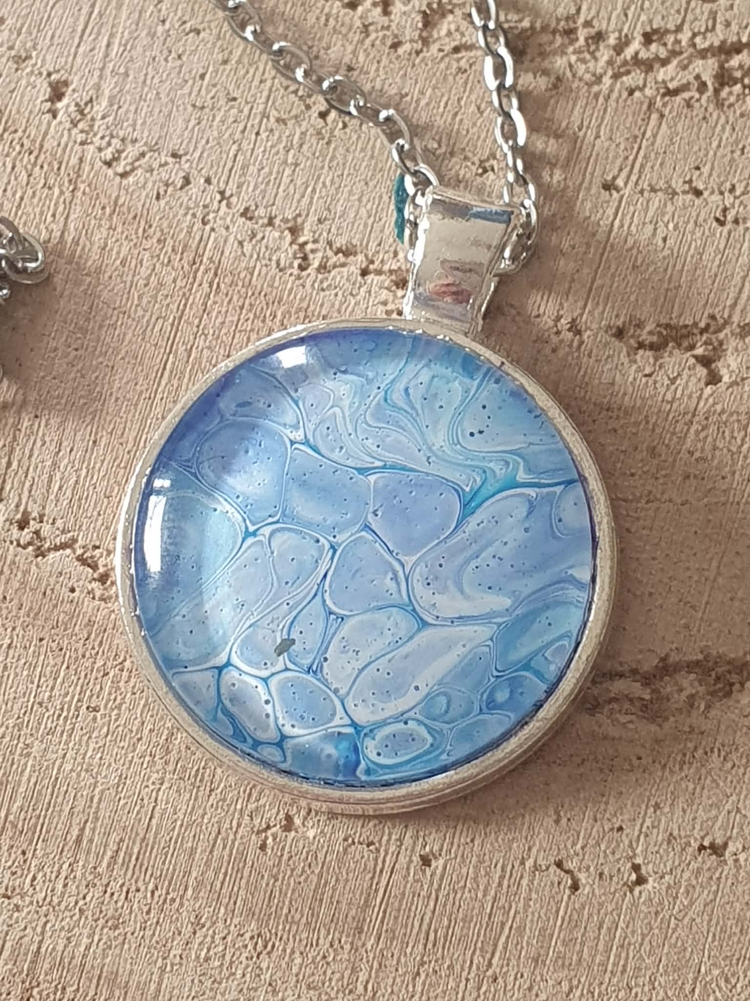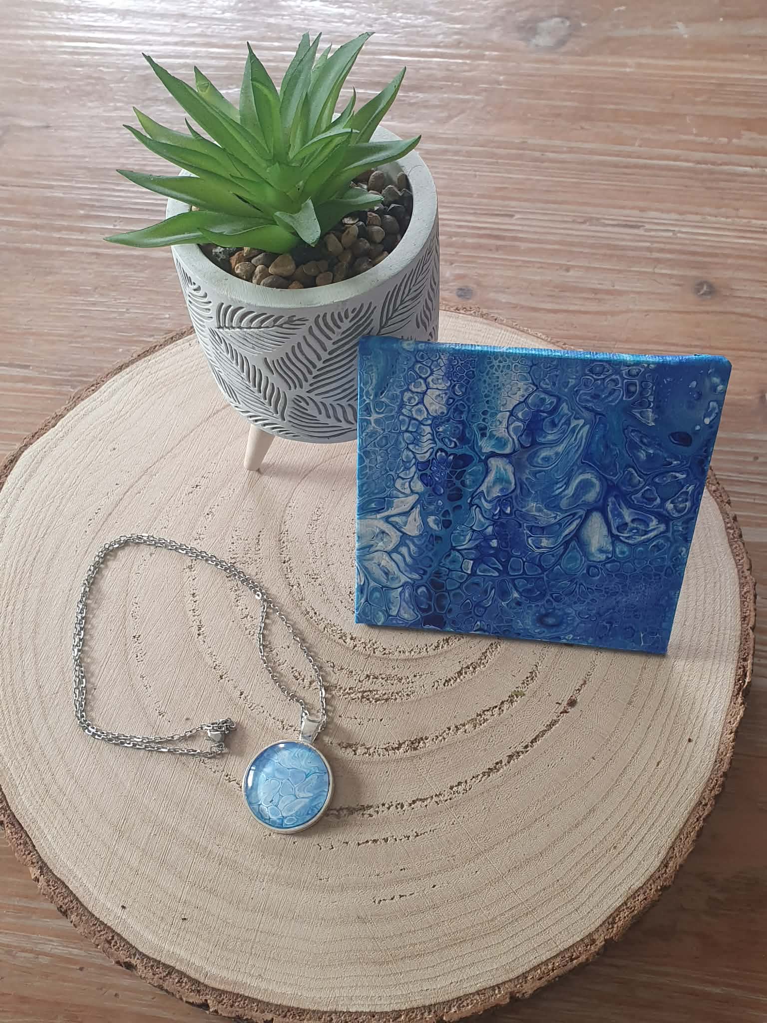 Le collier Vague Bleue est une création artistique qui évoque la fluidité et la profondeur des vagues marines. L’acier argenté met en valeur les nuances de bleu et les reflets de la peinture, pour un bijou à la fois élégant, poétique et contemporain.